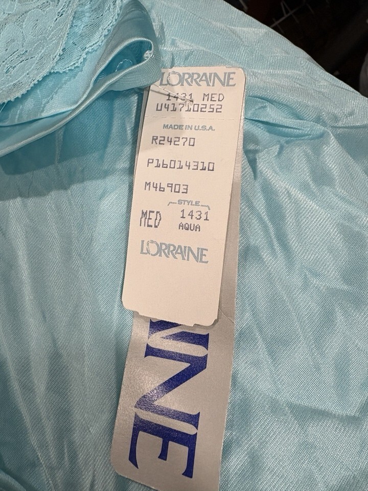 This vintage Lorraine nightgown in size medium is a charming piece from the 1980s, featuring a mint green color and a short sleeve button-down design. Made from nylon, this retro sleepwear exudes a rockabilly look and was manufactured in the United States. With its classic style and comfortable fit, this brand new nightgown is a delightful addition to any woman's vintage clothing collection.