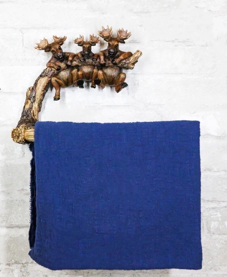? Enhance your rustic decor with our Rustic Elk Moose Hanging on Tree Branch Wall Hand Towel Bar! This charming piece features 3 whimsical moose gracefully perched on a faux wooden branch, bringing a touch of the wilderness into your home. The towel bar is perfect for hanging hand towels in your bathroom or kitchen, combining practicality with a delightful woodland aesthetic. Ideal for cabin-themed spaces or nature lovers, this wall-mounted holder adds character and charm to any setting.