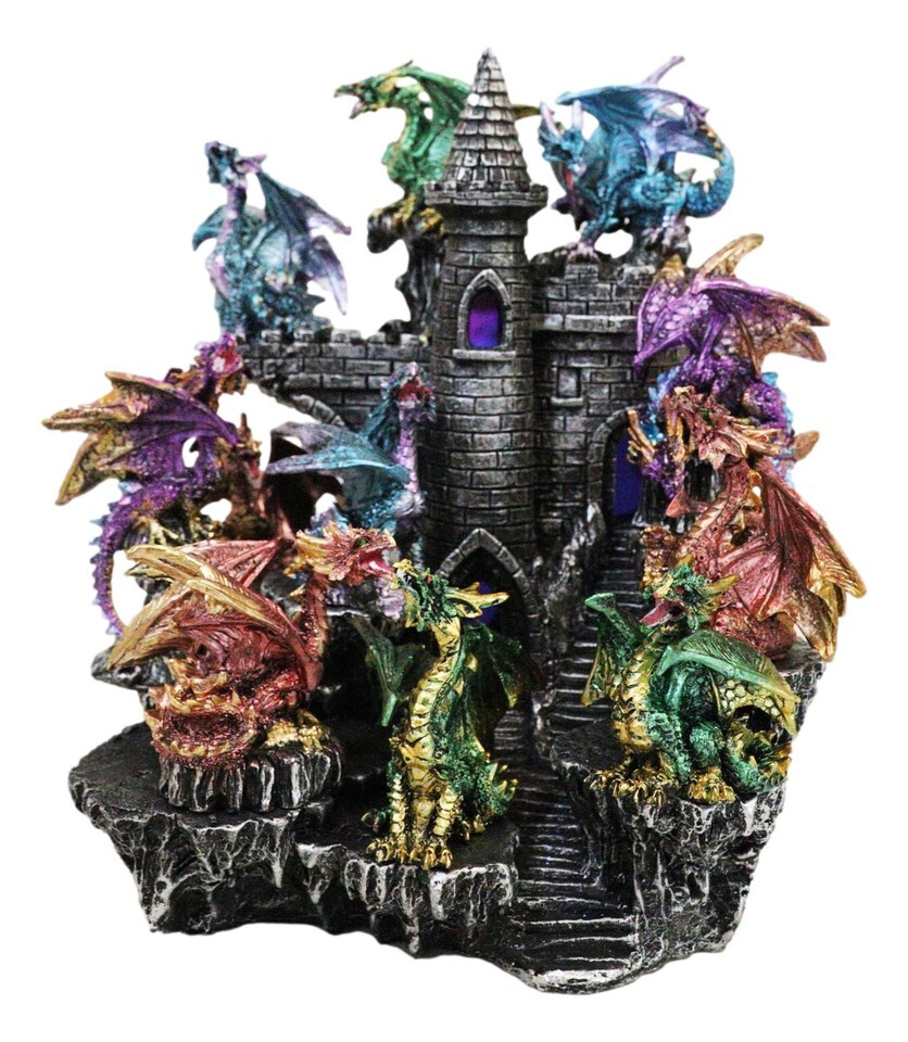 Medieval Colorful 12 Mini Dragons On Mountain Stonewall Castle Display Stand Set