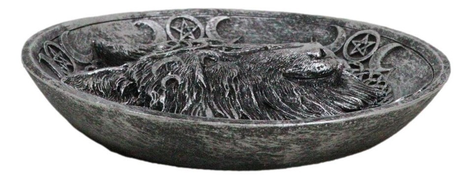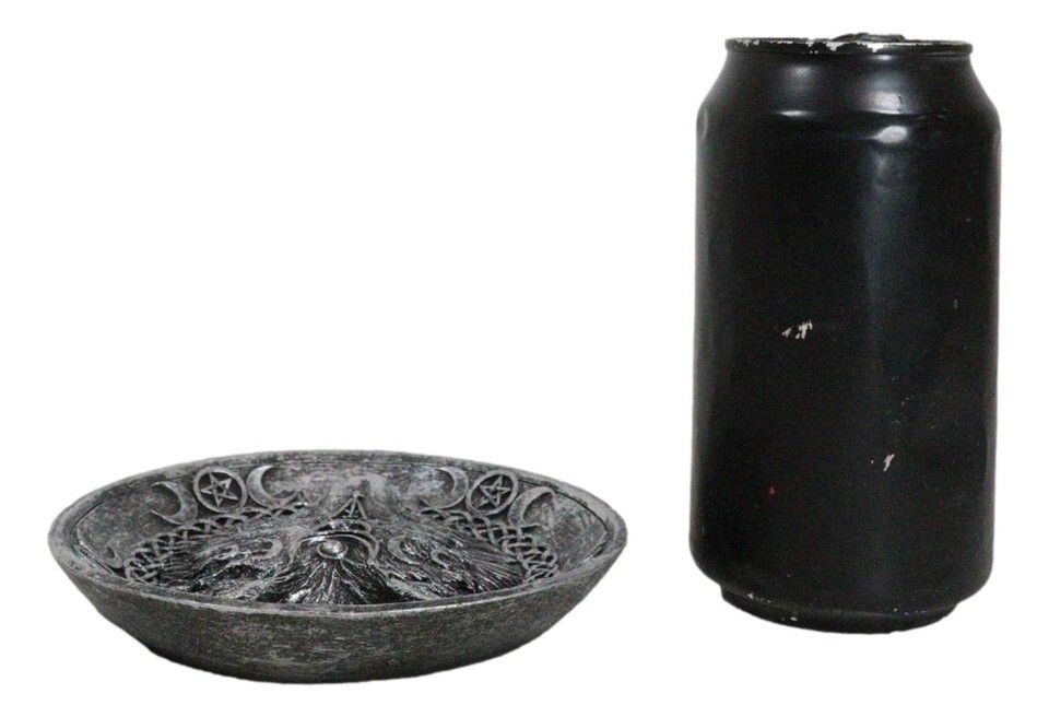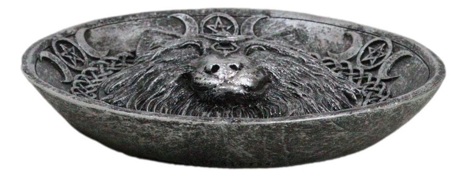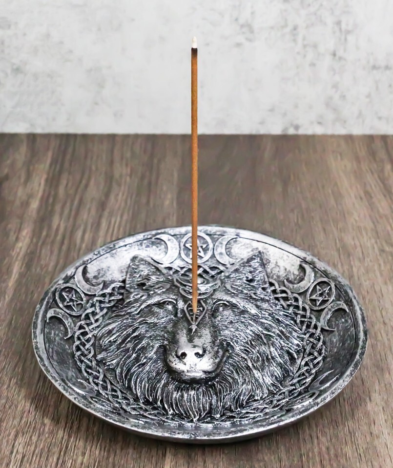 Wicca Celtic Knotwork Triple Moon Pentagram Gray Wolf Round Incense Holder