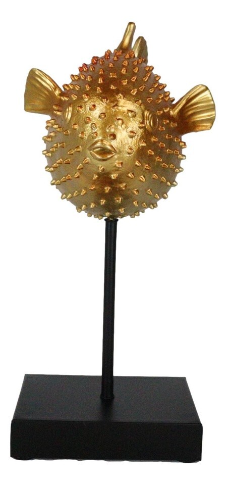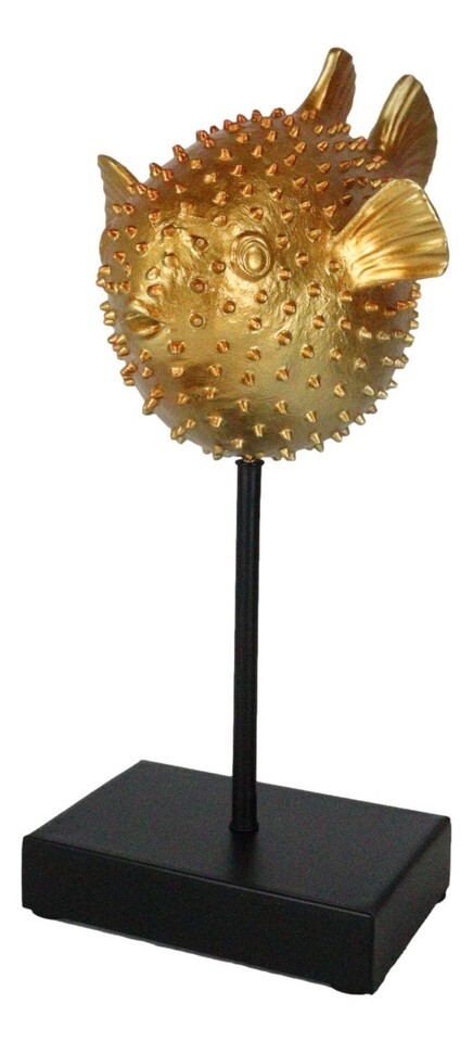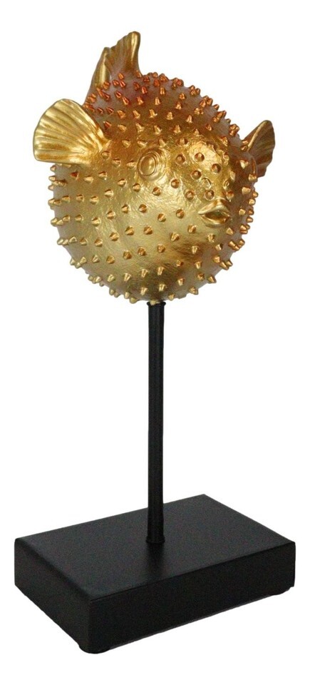 ? This Golden Pufferfish Sculpture On Pole Mount is made of high quality polystone, individually handpainted and polished. Because each piece is partially hand crafted, color tone may vary from pictures. The base stand is made of metal.
