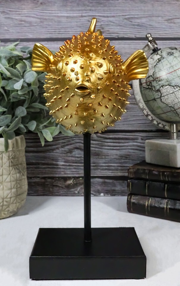 Nautical Marine Faux Taxidermy Golden Pufferfish Fish Sculpture On Pole Mount