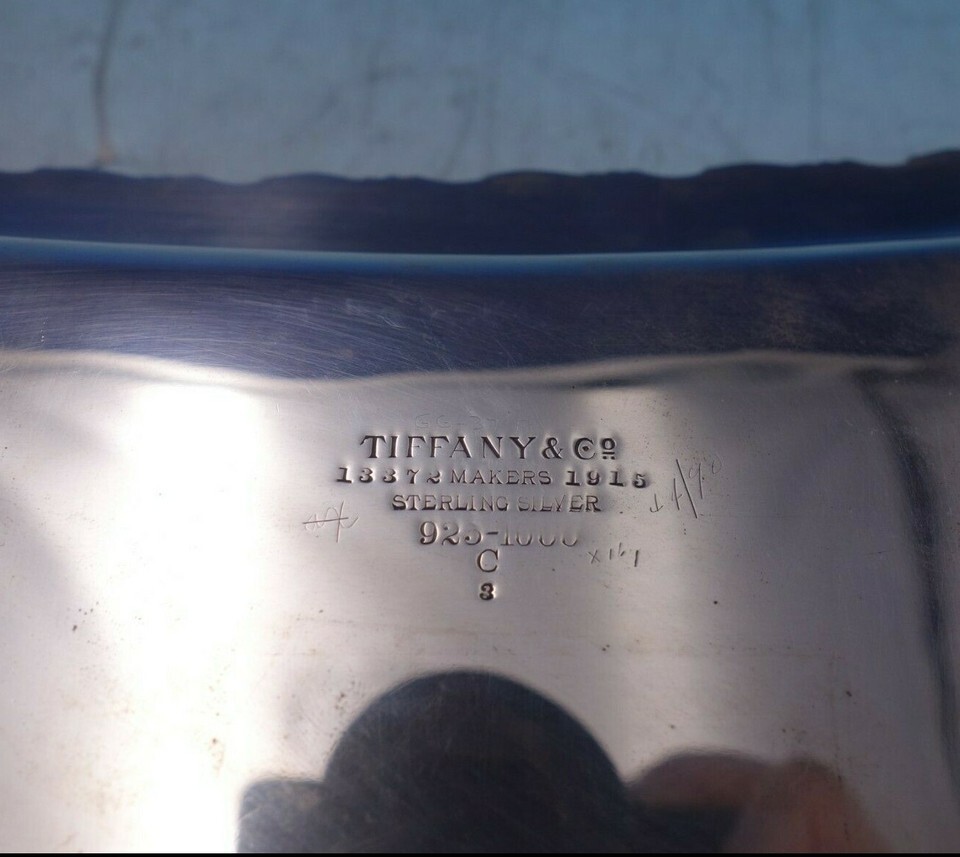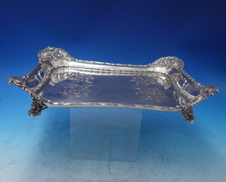 Stunning Chrysanthemum by Tiffany and Co sterling silver asparagus serving tray with pierced chrysanthemum scrollwork insert. The corners and feet feature large chrysanthemums. The piece is stamped with a "C" date mark for 1902-7 and #13372/1915. The measurements for the tray are 2 1/2" tall x 12 1/2" x 8 1/2", and it weighs 42.3 ozt. It is not monogrammed and is in good vintage condition. Extraordinary piece!