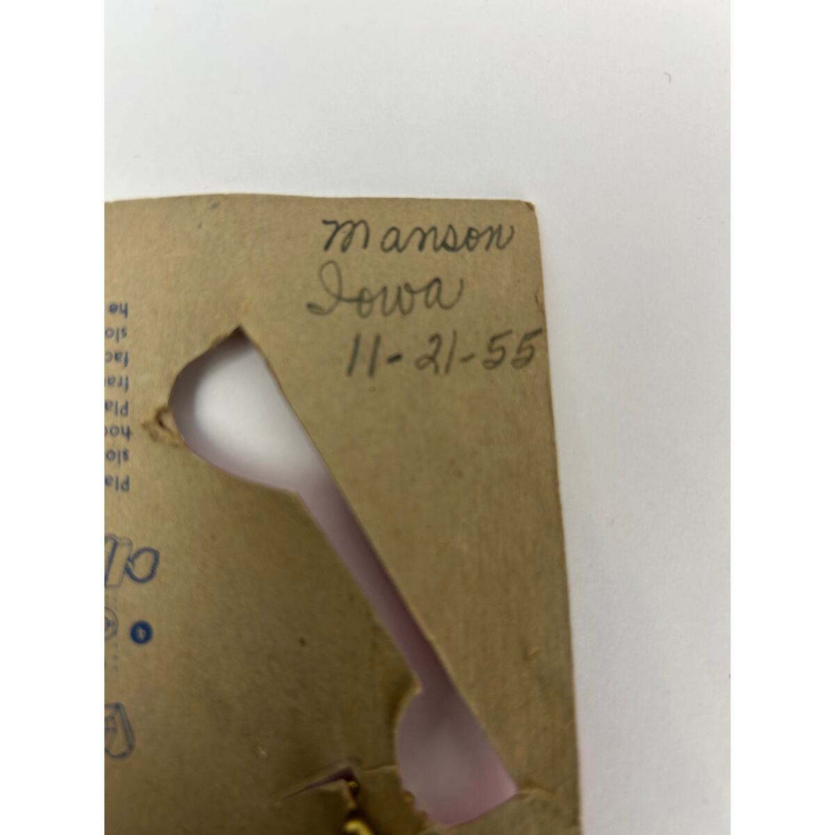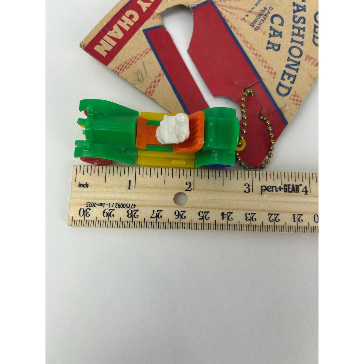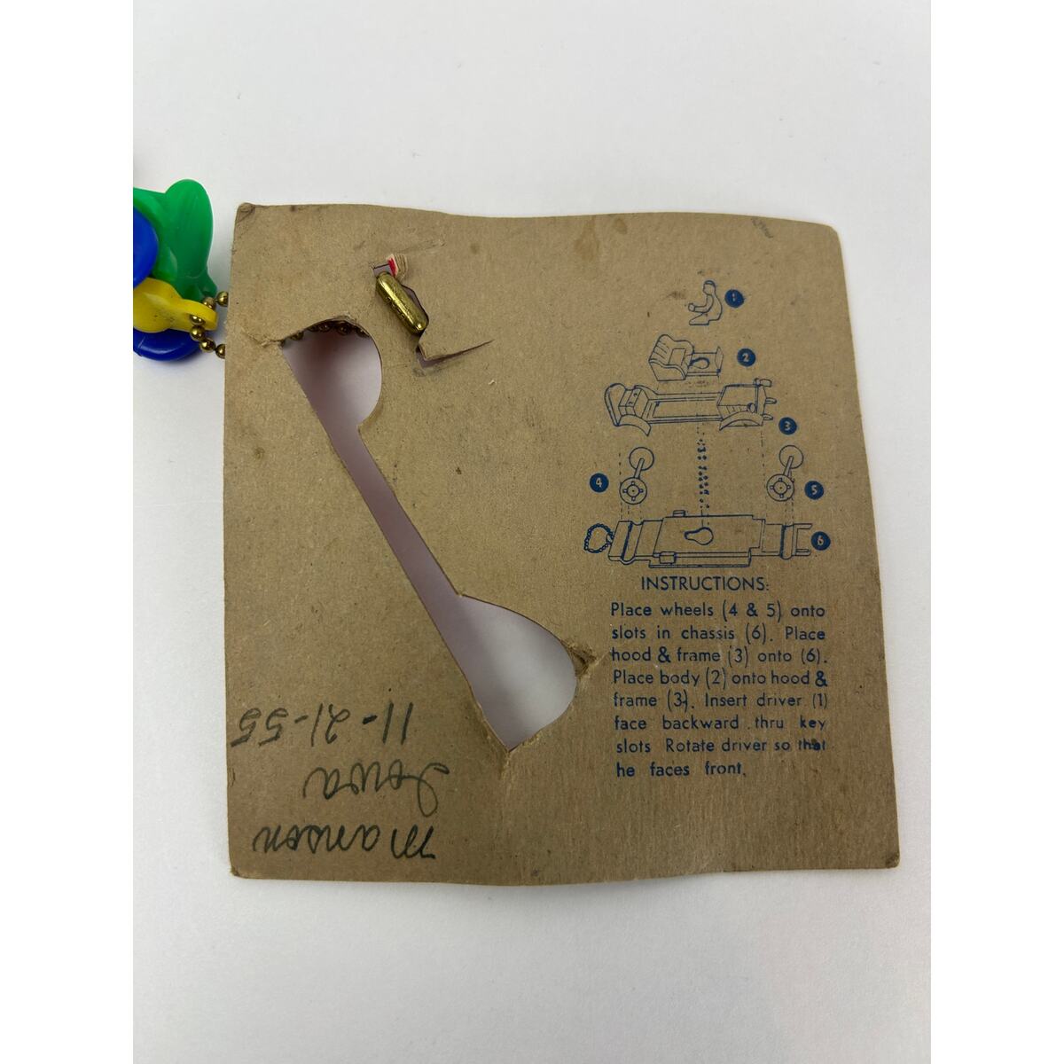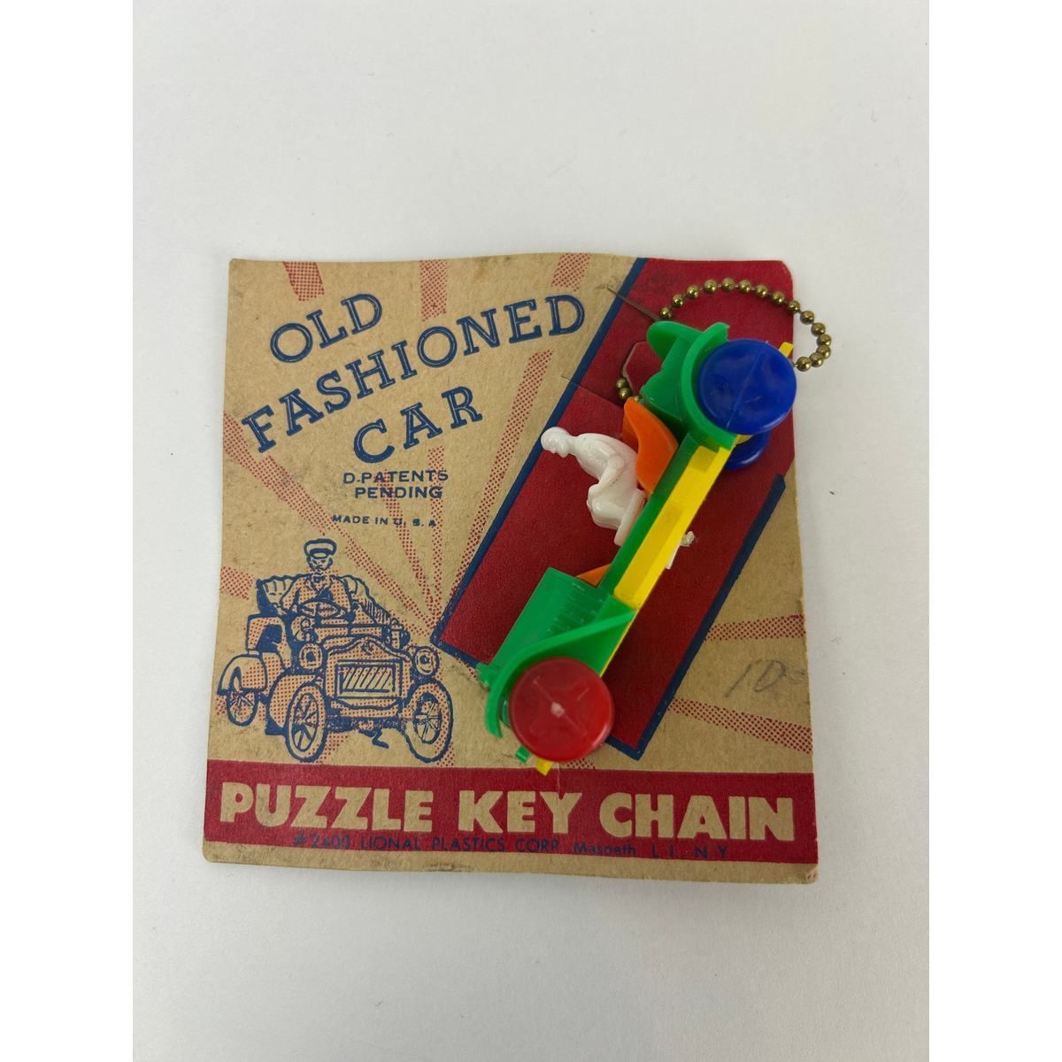 Original 1950s plastic Old Fashioned Car puzzle key chain by National Plastics Corp, Maspeth L.I. N.Y., on its original tan-and-red display card. Includes driver figure and printed assembly instructions on the reverse. Card is hand-dated ?Manson, Iowa 11-21-55.?