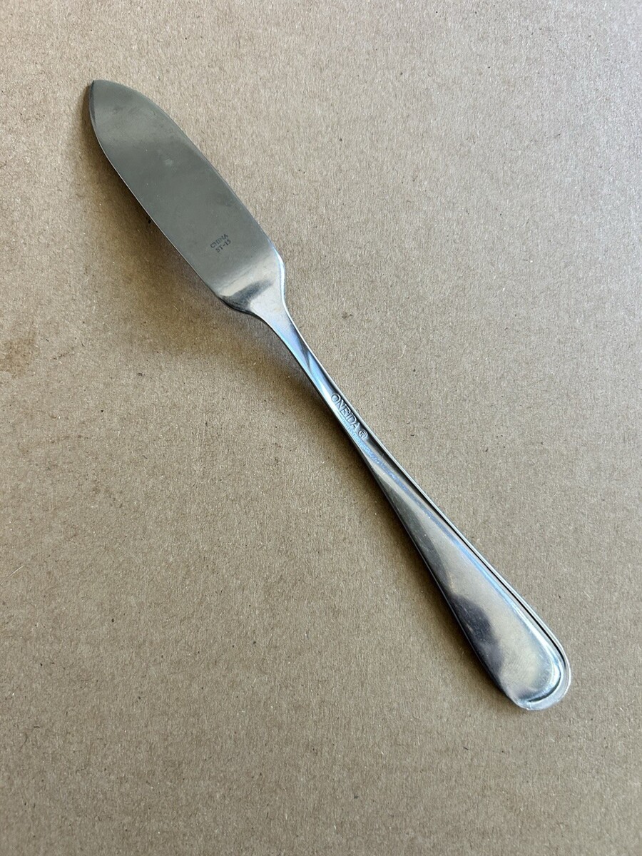 The Oneida Soar Master Flat Butter Knife is a high-quality kitchen utensil crafted from stainless steel. This sleek silver knife features a stylish stainless steel handle and is ideal for buttering bread or other foods. The set includes a single knife, making it a versatile and practical addition to any kitchen collection. Perfect for collectors or those looking for reliable and durable flatware pieces.