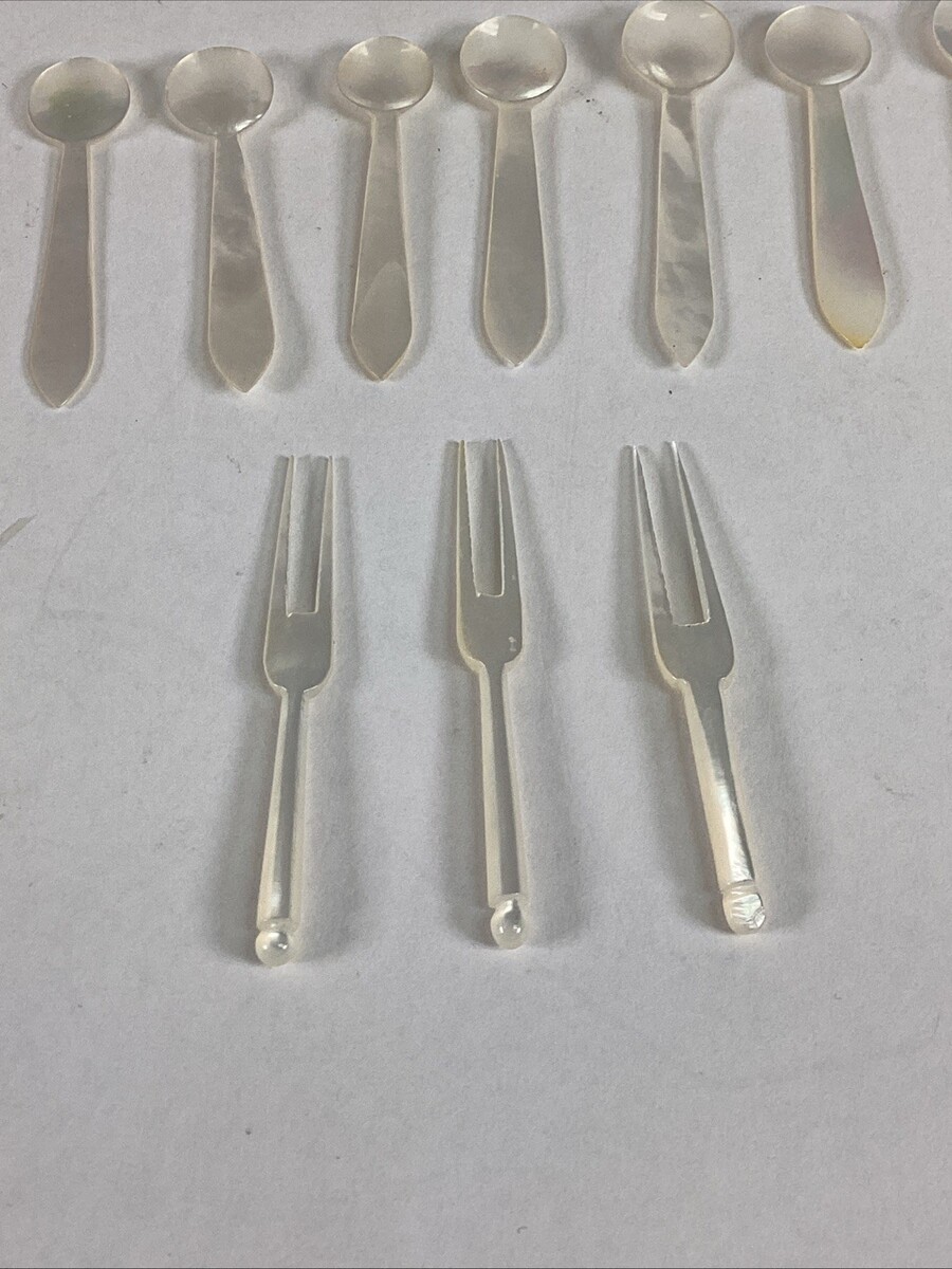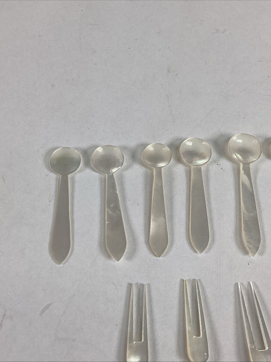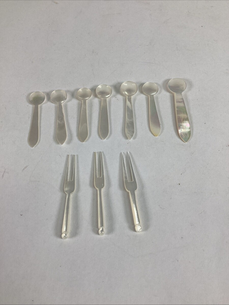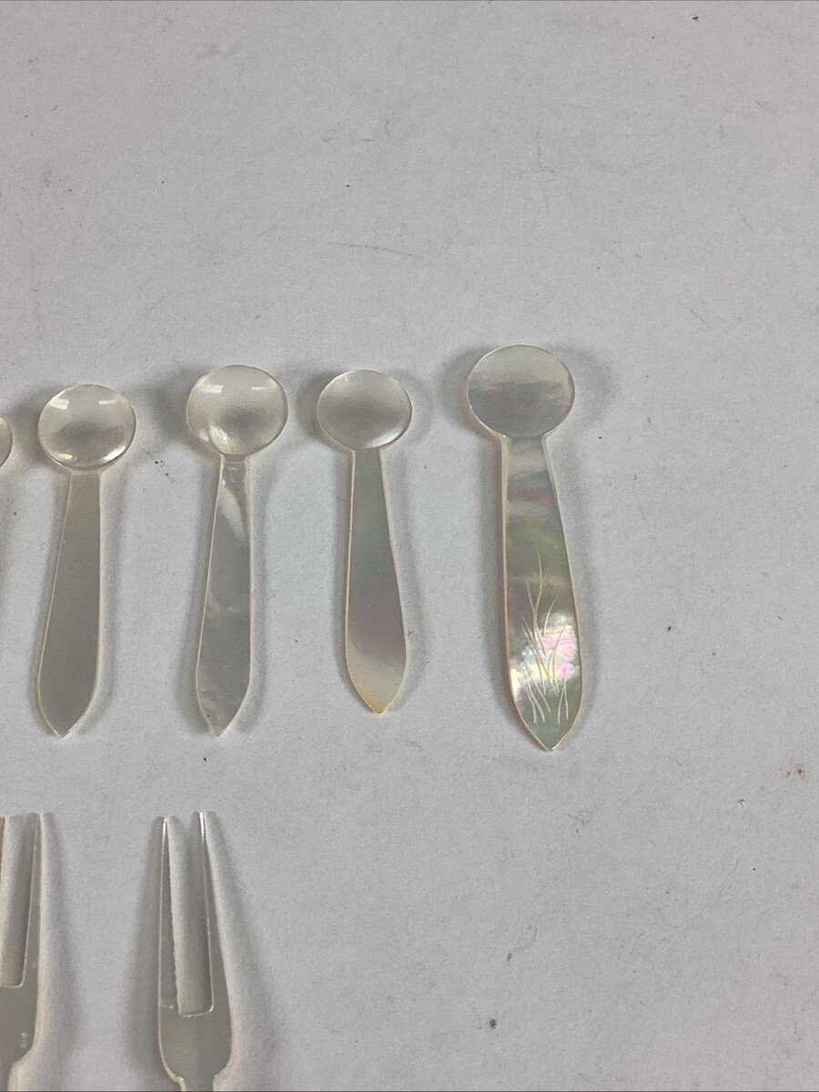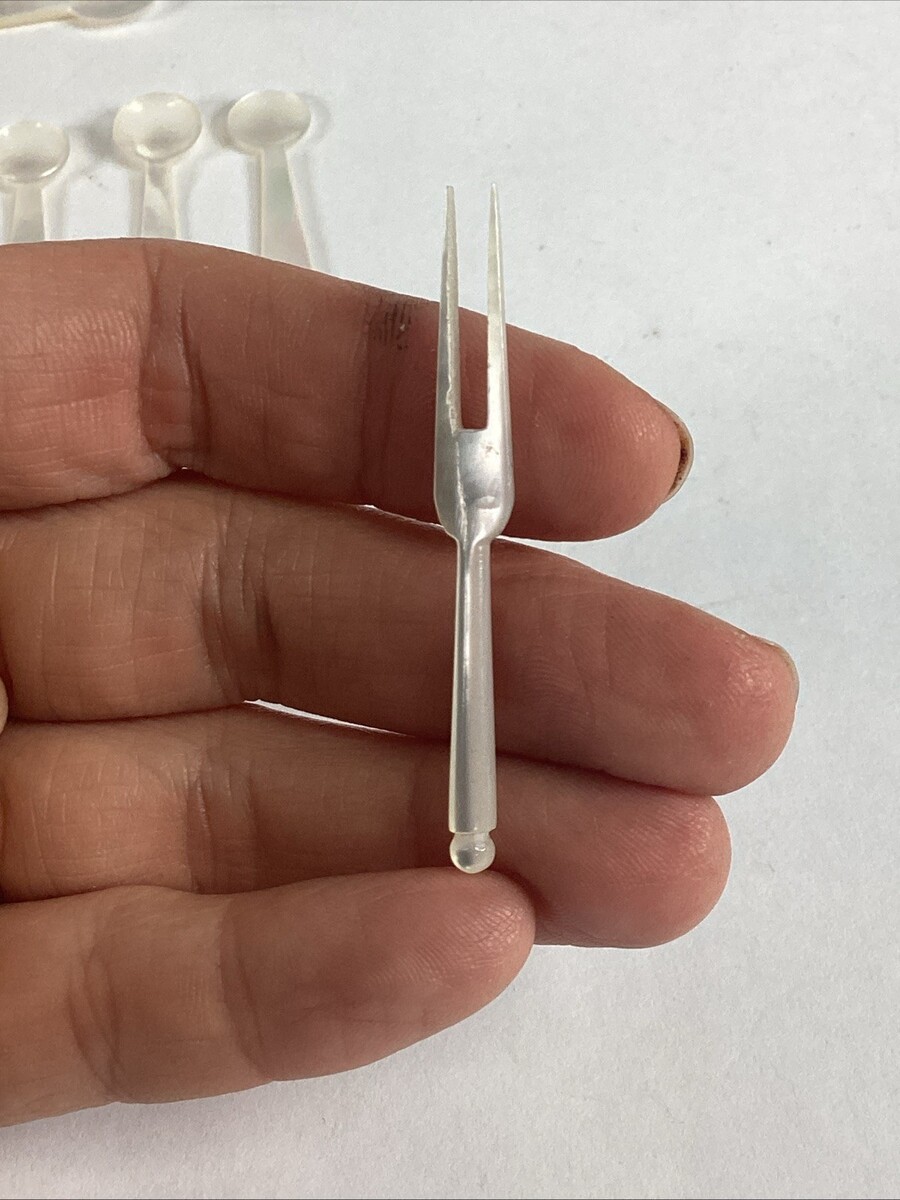 Lot Of 10 Mother Of Pearl Miniature Spoons/Forks. The spoons could be used in salt cellars and the forks look like they are for hors d?oeuvres or appetizers. The spoons are between 1.75-2 inches long.
