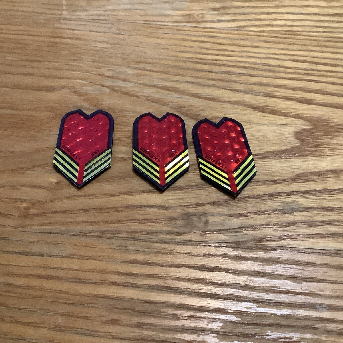 Set of three red with black and gold dart flights. New, older stock. Feel free to email with questions. I do combine shipping on multiple items. Have a great day!