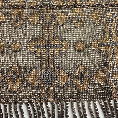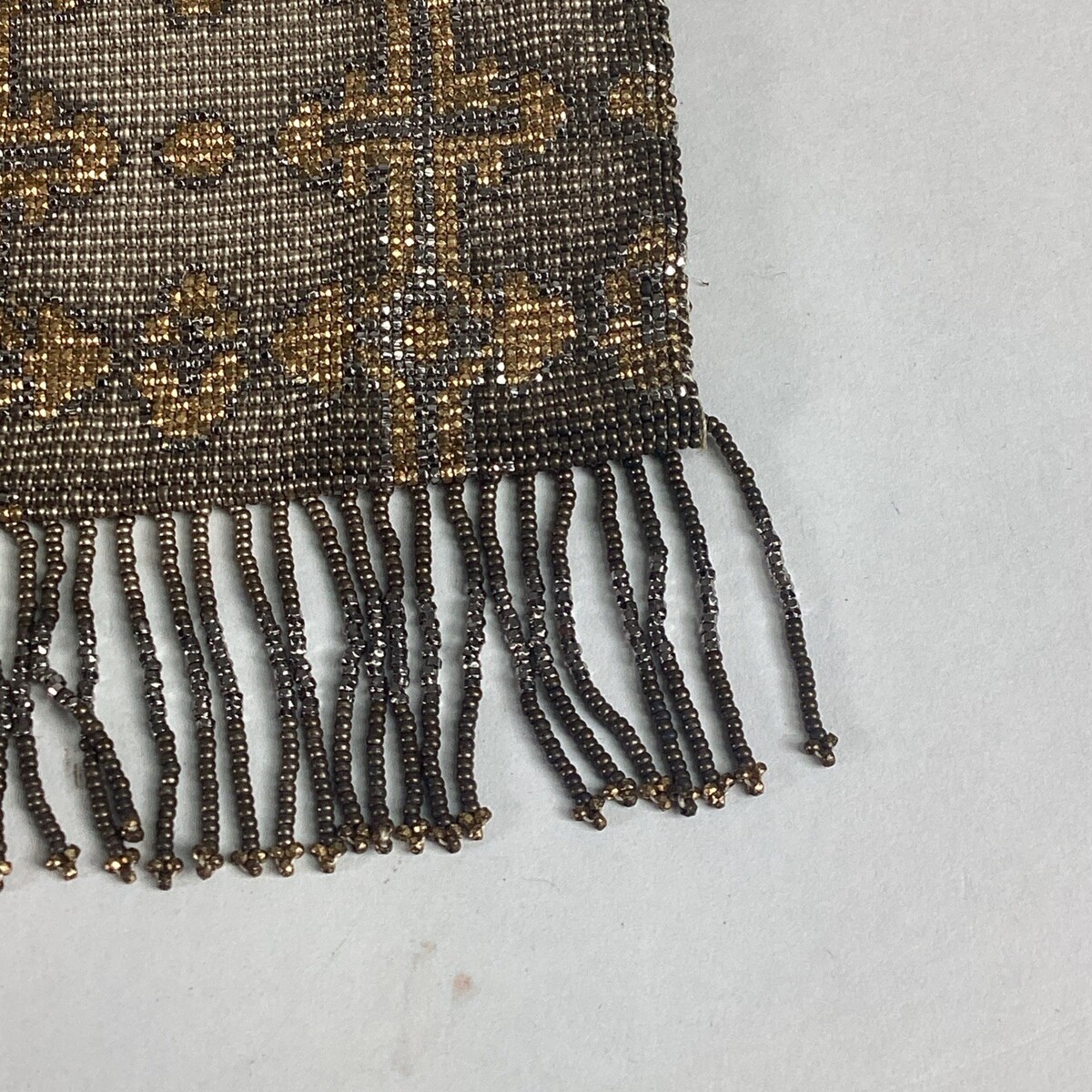 Antique Steel Micro Bead Evening Purse With Fringe. In good condition overall. It does have 1 imperfection on the interior. Where it shows the snap, it has come apart on the opposite side so it would need to be fixed/resown. This bag measures 5.25x4? not including the fringe. The strap is 4.5? long and the interior measures 5.25x2? (stretched) and is 3.5? deep.