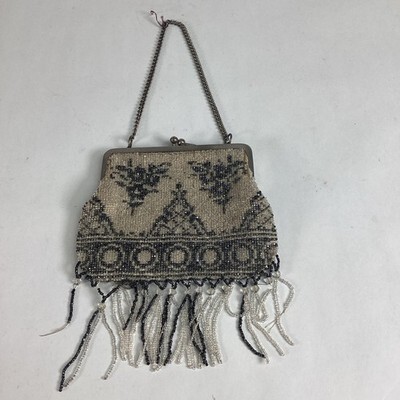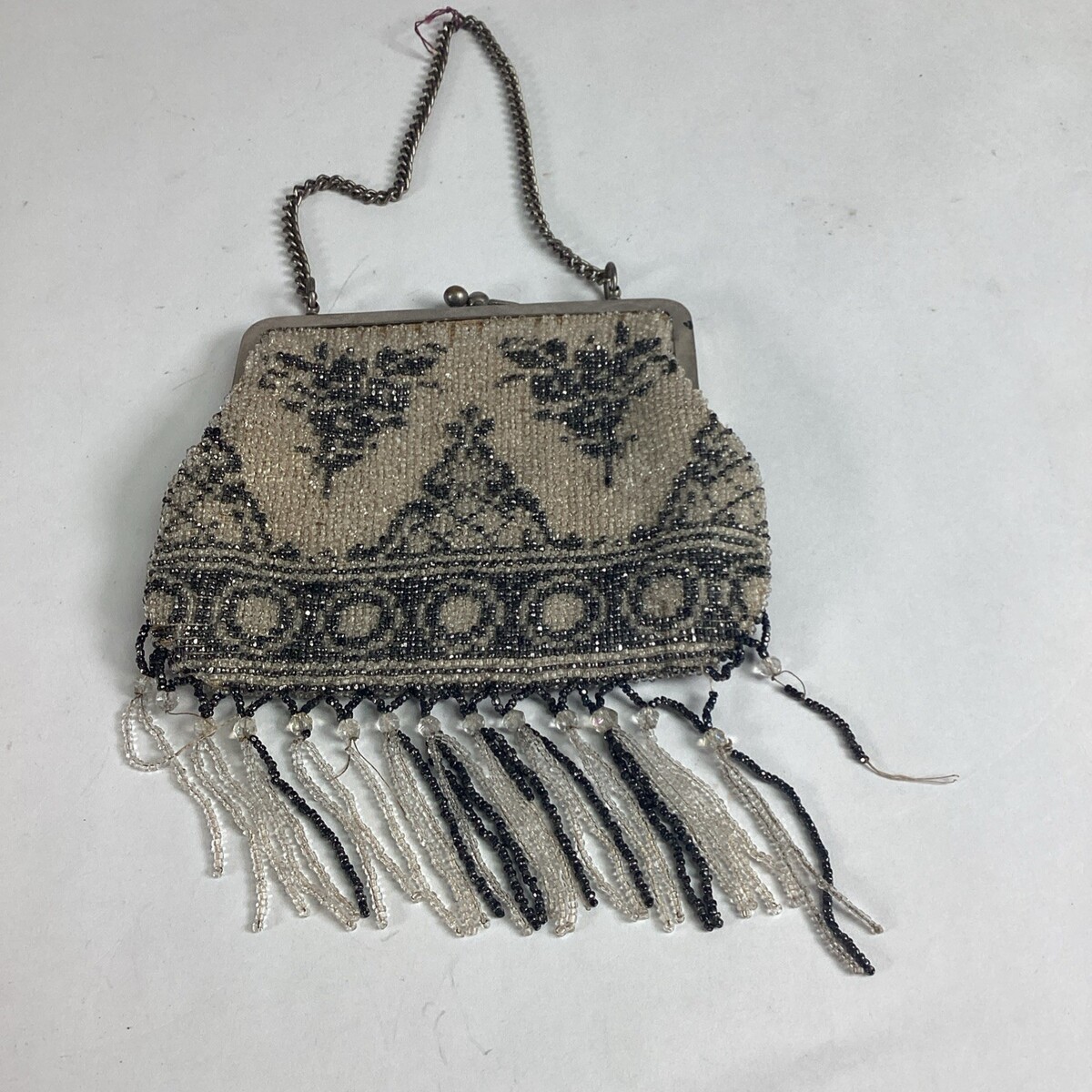 Vintage Beaded Evening Bag With Fringe. This is in used condition. There are beads missing on both sides of the bag and on the fringe. There is 1 loose piece of fringe that is included in the bag. Also, a small mirror is included as well. The bag including the fringe measures 7x6?. Without the fringe, it?s 4.5?. The chain is 6.5? long and the mirror measures 2.75x2?. The interior of the bag is 4.5x3.25x4?