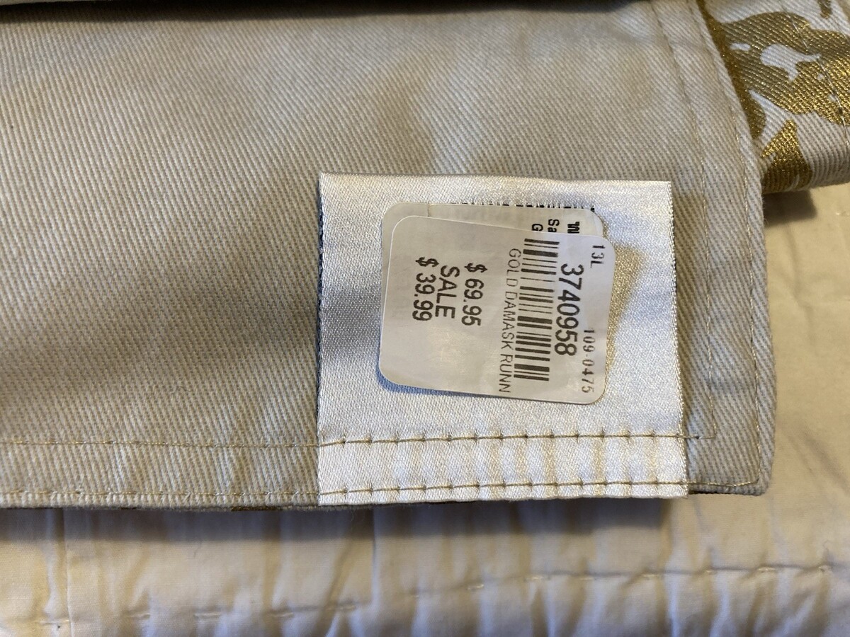 NEW Vintage Williams Sonoma Damask Gold Table Runner. Extra long size at 105 inches x 16 inches wide.