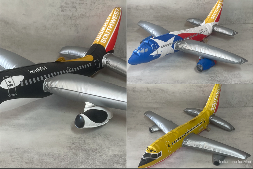 The product features three inflatable promotional giveaways featuring Southwest Airlines Boeing 737 planes. These inflatables are likely small replicas of the aircraft and were used as promotional items by Southwest Airlines. Perfect for aviation enthusiasts or collectors of airline memorabilia, these inflatables are a unique and fun way to show your appreciation for Southwest Airlines and the Boeing 737 aircraft.