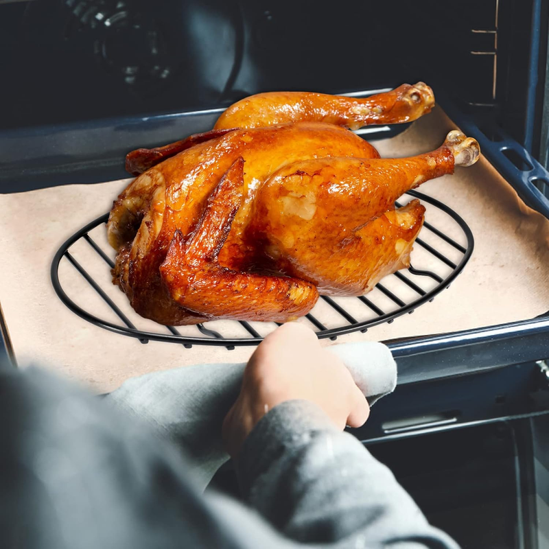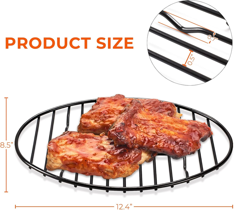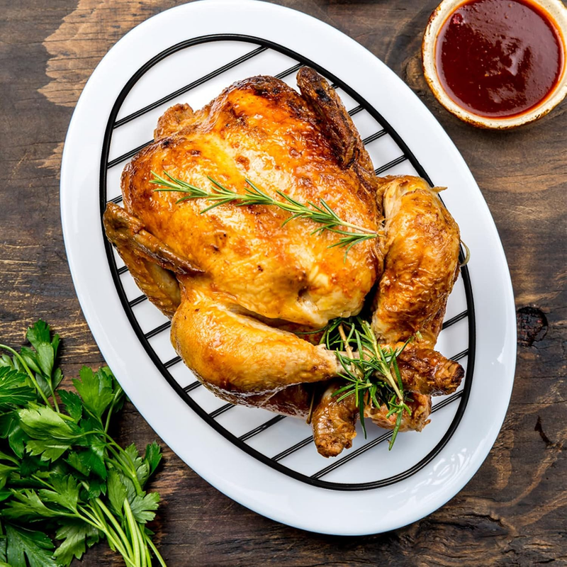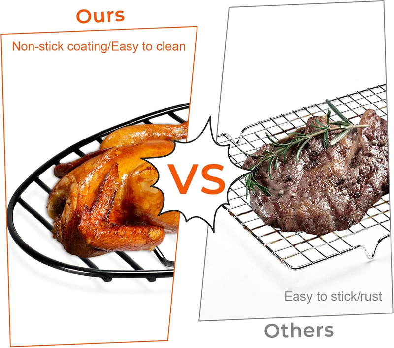 The 12*8.5in oval roasting rack perfect for roasting, grilling, baking, broiling, bbq, fish desserts; baking rack for many sizes and shapes of roasting pans; Baking rack for oven cooking is safe for oven-use up to 575?.