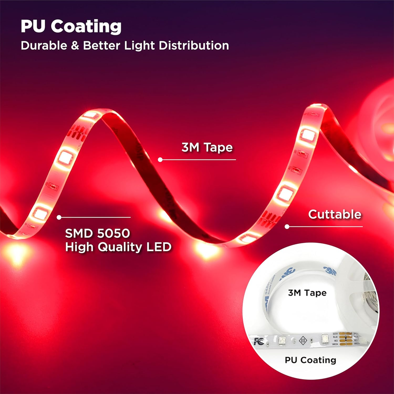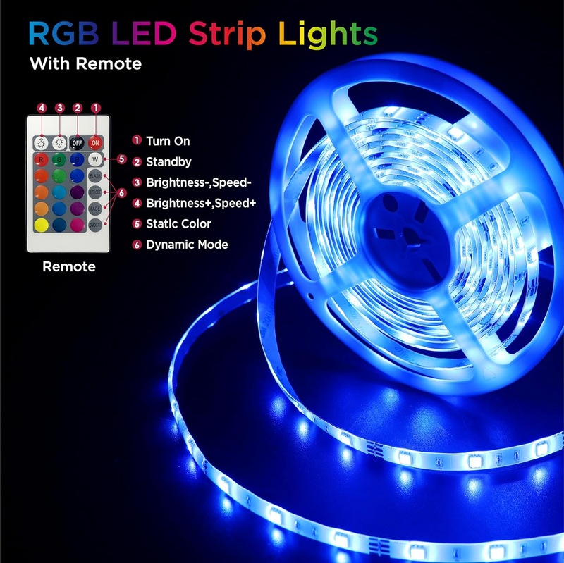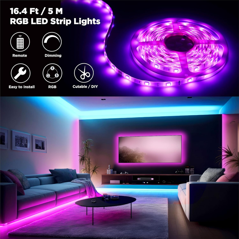 Add vibrant color and ambiance to any space with this 16.4FT (5M) RGB LED Strip Light Kit. Perfect for bedrooms, kitchens, TVs, desks, and more, this set includes a remote, power adapter, and durable PU coating for longer-lasting use.
