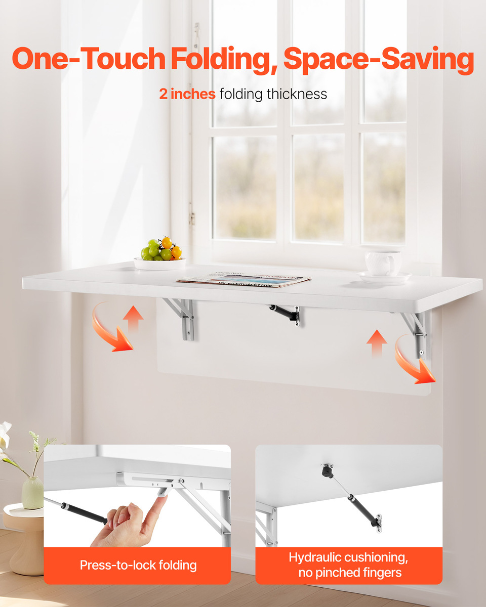 Slow-Closing Folding: Designed to save space, this wall mounted folding table folds and unfolds quickly, ideal for small spaces. The slow-closing brackets prevent pinching during use, making it ultra-convenient for immediate use without the need for large reserved spacesโjust unfold and start working or display items.