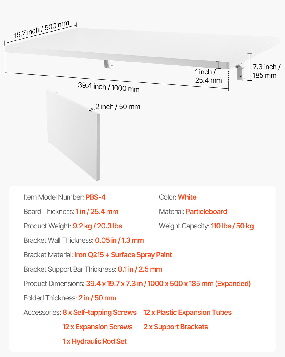 VEVOR Wall Mounted Folding Table, 39.4 x 19.7 inches Wall Mount Table, White