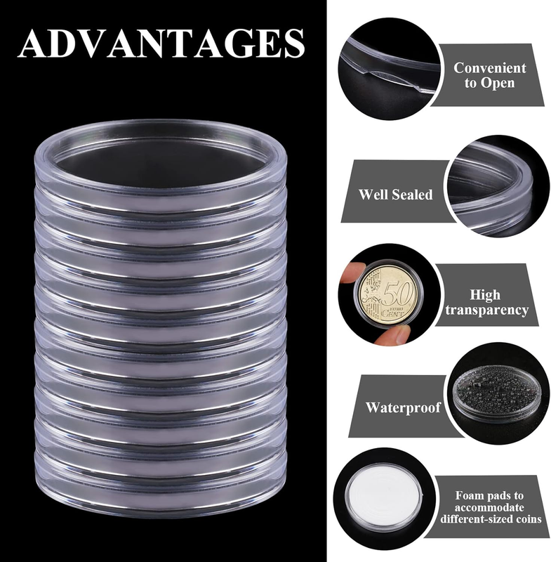 Size: Coin case inner diameter 40mm/1.57in, outer diameter 44mm/1.73in. Foam washer size: 38mm/33mm/30mm/27mm/25mm/20mm/17mm, which can hold 7 different sizes of coins and prevent coins from moving around. Note: Please confirm the coin box size and your coin size before you buy.