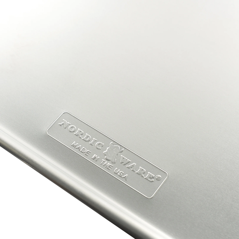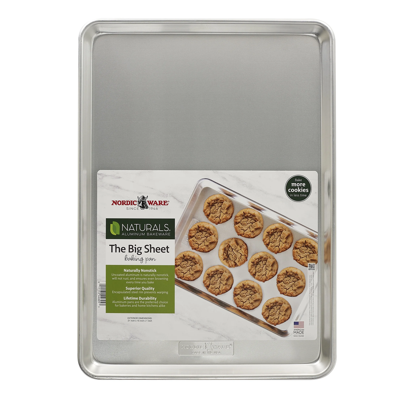 Make mega batches of cookies and bars with this extra large sheet pan. Fits most standard size ovens. 35 percent larger surface than the half sheet! Our commercial-duty Naturals Bakeware is made of even-heating, rust-proof aluminum and features a galvanized steel encapsulated reinforcement around the rims for added strength. Bakers agree that aluminum bakes and browns best. Whether you're cooking sweet or savory foods or even sheet pan means, this pan feeds a crowd and allows you to cook more food in less time. Proudly made by Nordic Ware, a family owned company