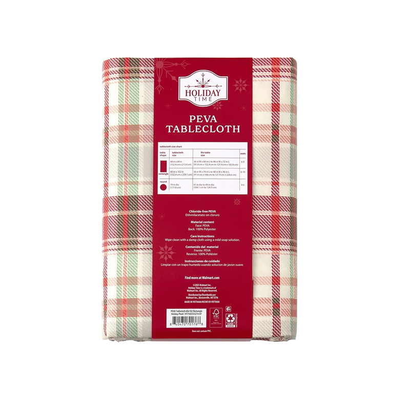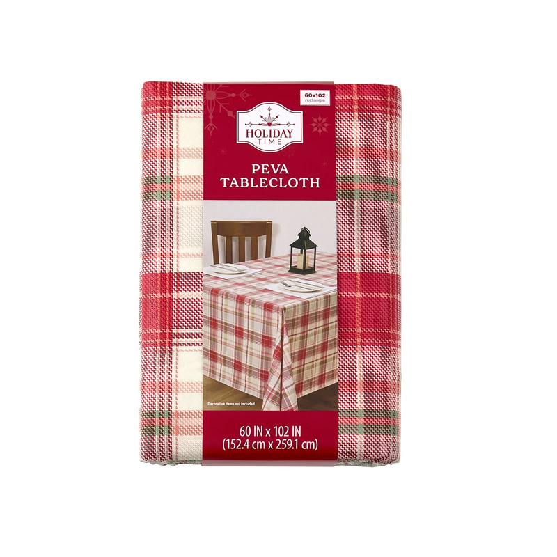 Holiday Time Christmas Plaid Tablecloth, Party Decoration 60" x 102" - Multi VERSATILE SIZE OPTIONS: Comes in three convenient sizes?60x84 inches, 60x102 inches, and a 70-inch round?perfect for holiday dinners, buffet tables, or Christmas brunches. CHEERFUL HOLIDAY DESIGN: Adorned with merry Christmas patterns that bring joy and seasonal charm to any dining space. DURABLE CELEBRATION-READY: Made with a PEVA top that?s perfect for handling spills from hot cocoa, eggnog, or Christmas feasts. IDEAL FOR HOLIDAY GATHERINGS: A wonderful addition to indoor parties, cookie decorating, or any festive get-together with family and friends. EASY TO CLEAN: Simply wipe clean with a damp cloth?no need for machine washing, so you can spend more time enjoying the holidays.