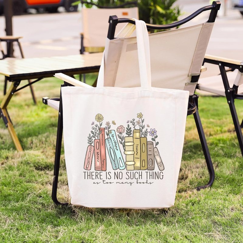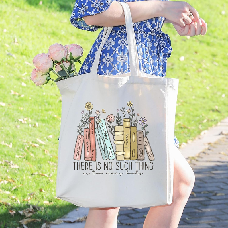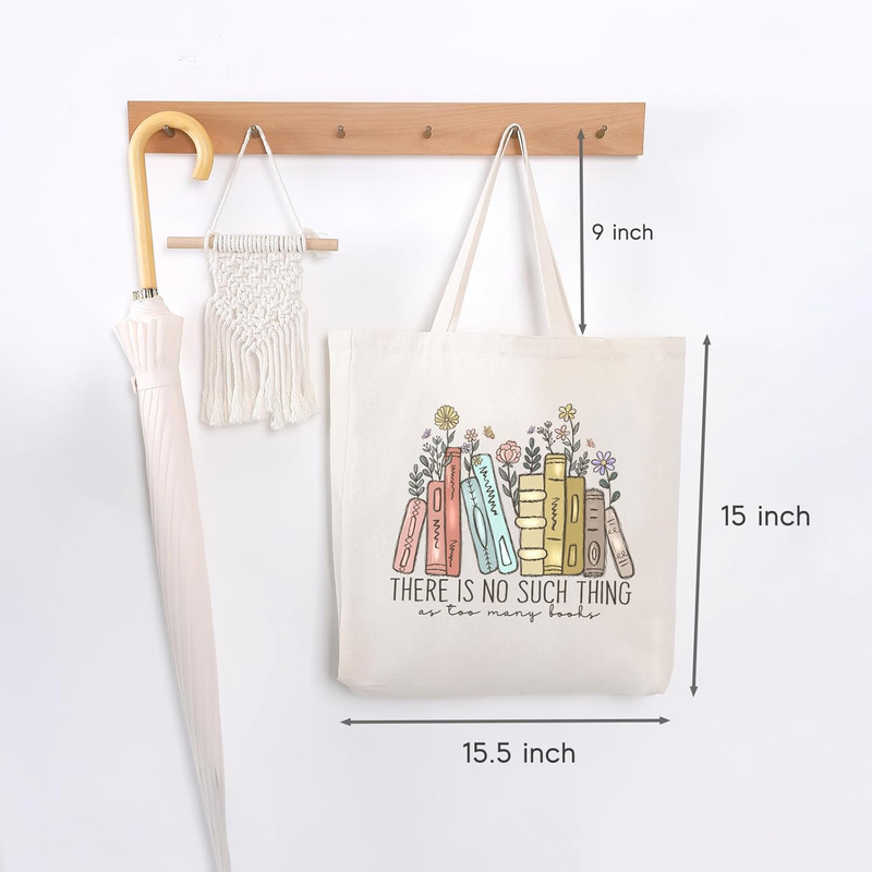 Book lover gifts for women; Printing with funny sayings "there is no such thing as too many books," this canvas tote bag makes book themed gifts for book lovers, bookworm, reader, librarian, author; It's a thoughtful and stylish gesture that celebrates the love of books and the beauty of nature.