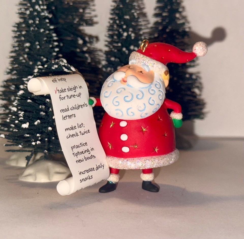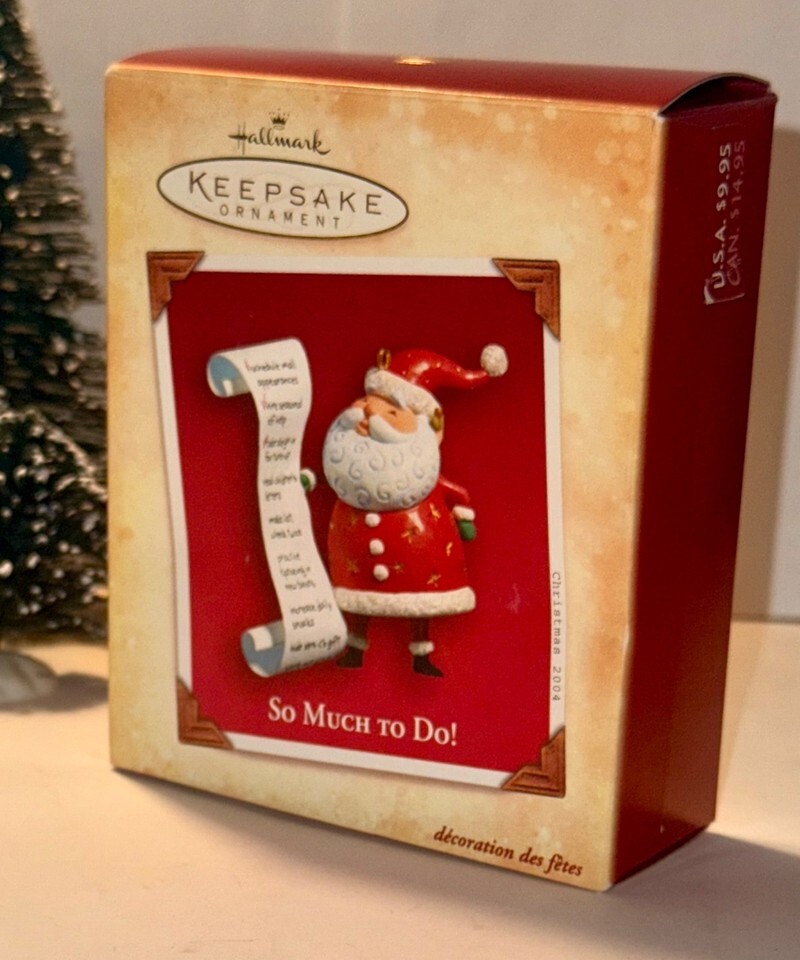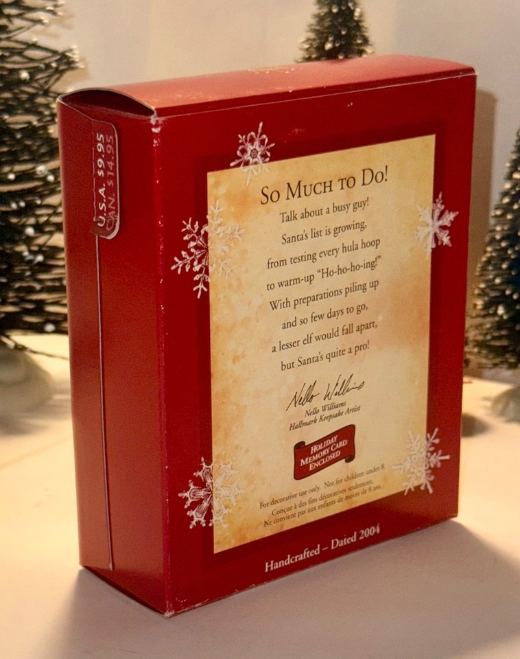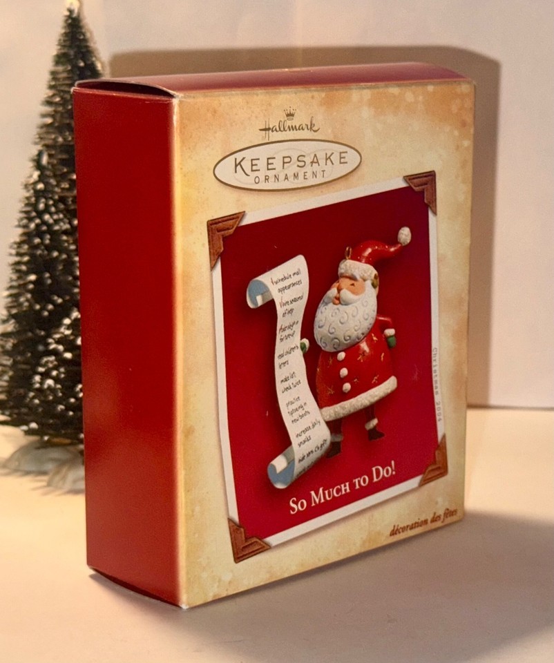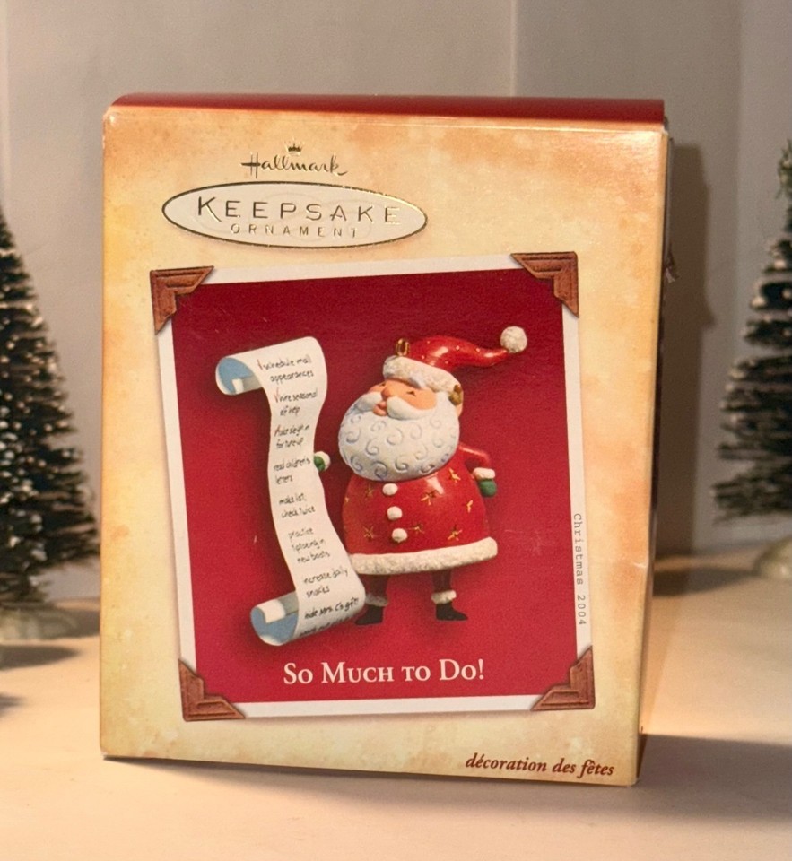 Santa is very bus, and boy that checklist won't complete itself! This is the 2004 Hallmark Keepsake ornament designed by Nello Williams title So Much To Do! The ornament is in excellent condition. It comes in its original packaging inside and out, and includes the holiday memory card. The outer box has very minor scuffs but is overall great shape.