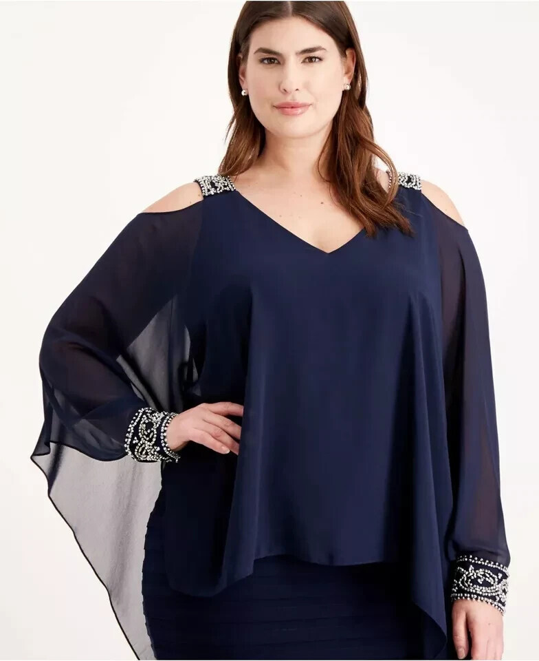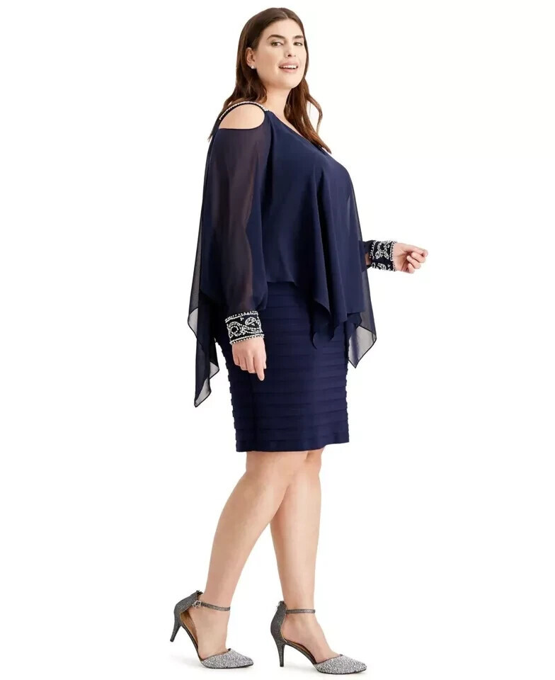 BETSY & ADAM Cold-Shoulder Popover Dress Navy Silver Beads Plus Size 16W Stretch