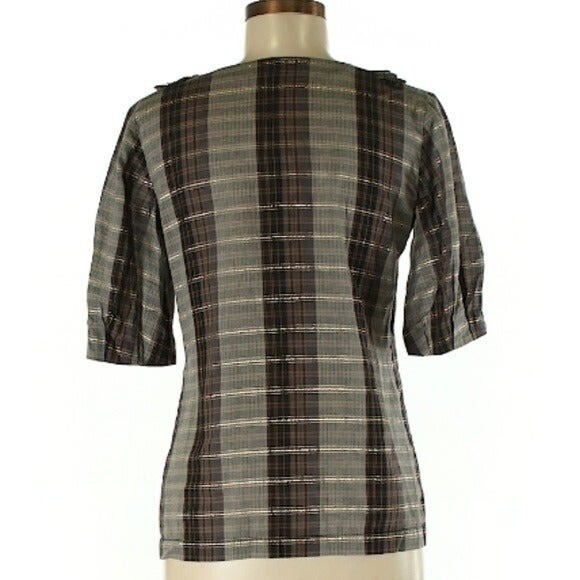 Eliot Brown Plaid Print 3/4 Sleeve Blouse size XS ruffle details sparkles