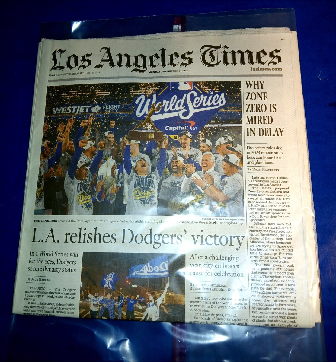 This is a LOS ANGELES TIMES Nov 3, 2025- WORLD SERIES CHAMPIONS LA DODGERS -NEW. Will seal in zip lock bag. Ships fast!