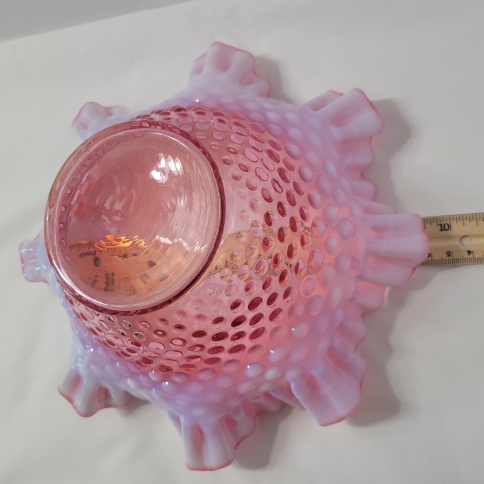 Vintage Cranberry Art Glass Fenton Opalescent Crimped Hobnail Bowl 9.5" Diameter