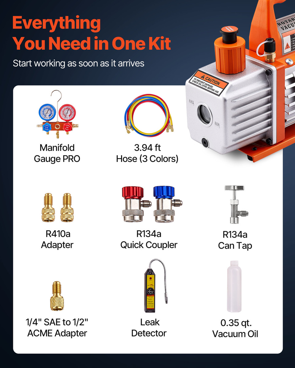 Everything You Need: This kit includes a vacuum pump, manifold gauge set, three-color hose, an R410a adapter, R134a quick couplers, a 1/4" SAE to 1/2" ACME adapter, a leak detector, an R134a can tap, a bottle of 0.35 qt vacuum oil, and a carry bag
