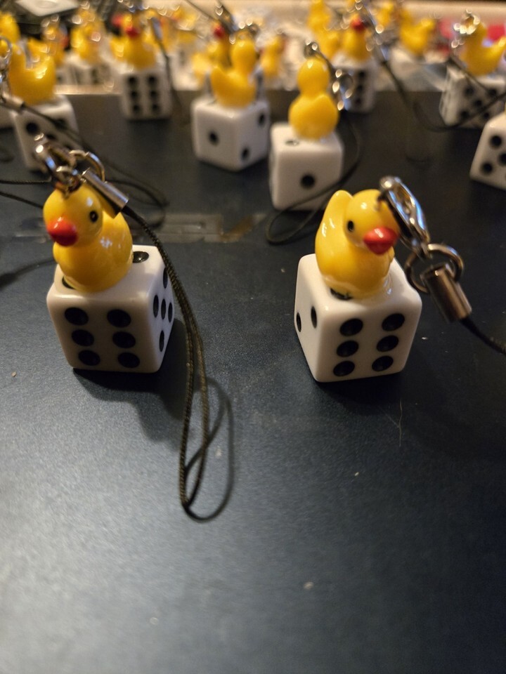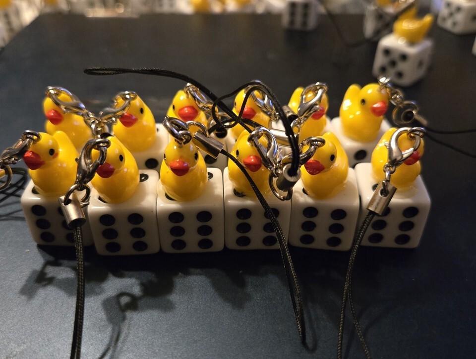 The product is a cute cell phone charm featuring a duck and dice design. This set is a collectible item perfect for those who love unique and fun accessories for their phone. The charm adds a playful touch to the phone and can be a fun addition to a collection of collectible figures and bobbleheads.