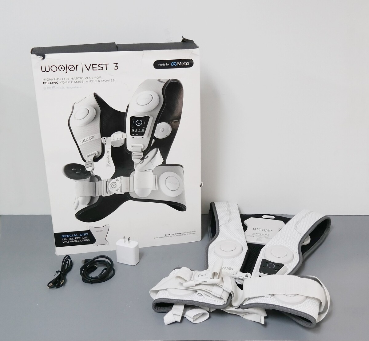 Description: Includes Retail Packaging, Haptic Vest 3, USB-C Charging Cable with Power Brick, Washable Lining, 3.5mm Audio Cable