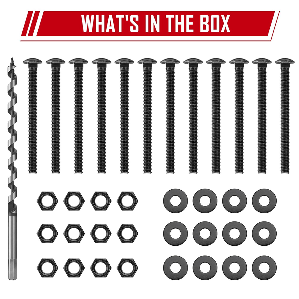 Carriage Bolt Kit with Auger Drill Bit - 12 Bolts, Washers, and Nuts