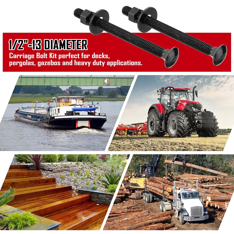 The Carriage Bolt Kit is especially suitable for constructing decks, pergolas, and gazebos, as well as for heavy-duty applications. With a thread size of 1/2"-13, this kit provides the strength and stability needed for outdoor structures.