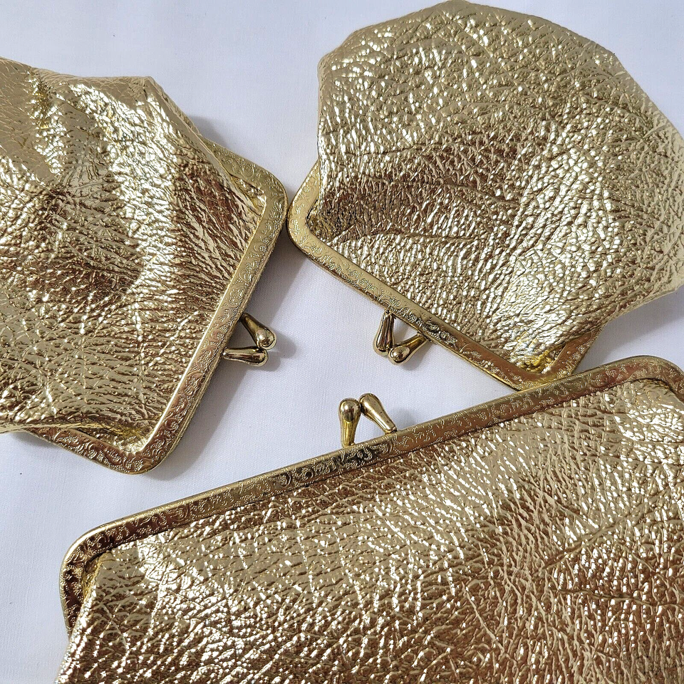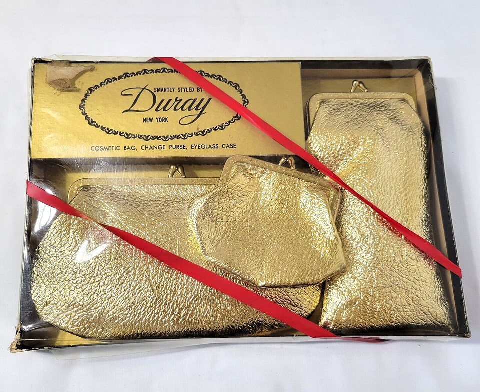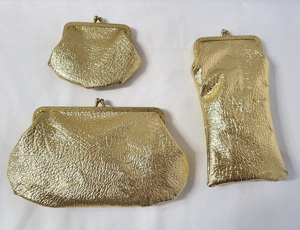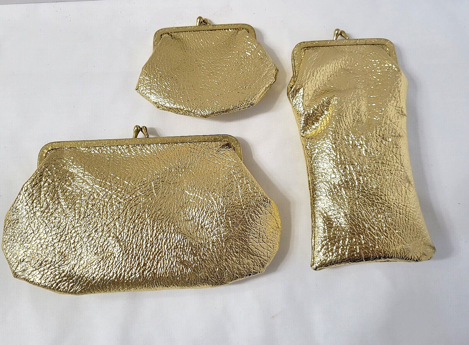 Vtg Gold 3 pc Soft Accessory Set by Duray Eyeglass Case Cosmetic Bag Coin Purse