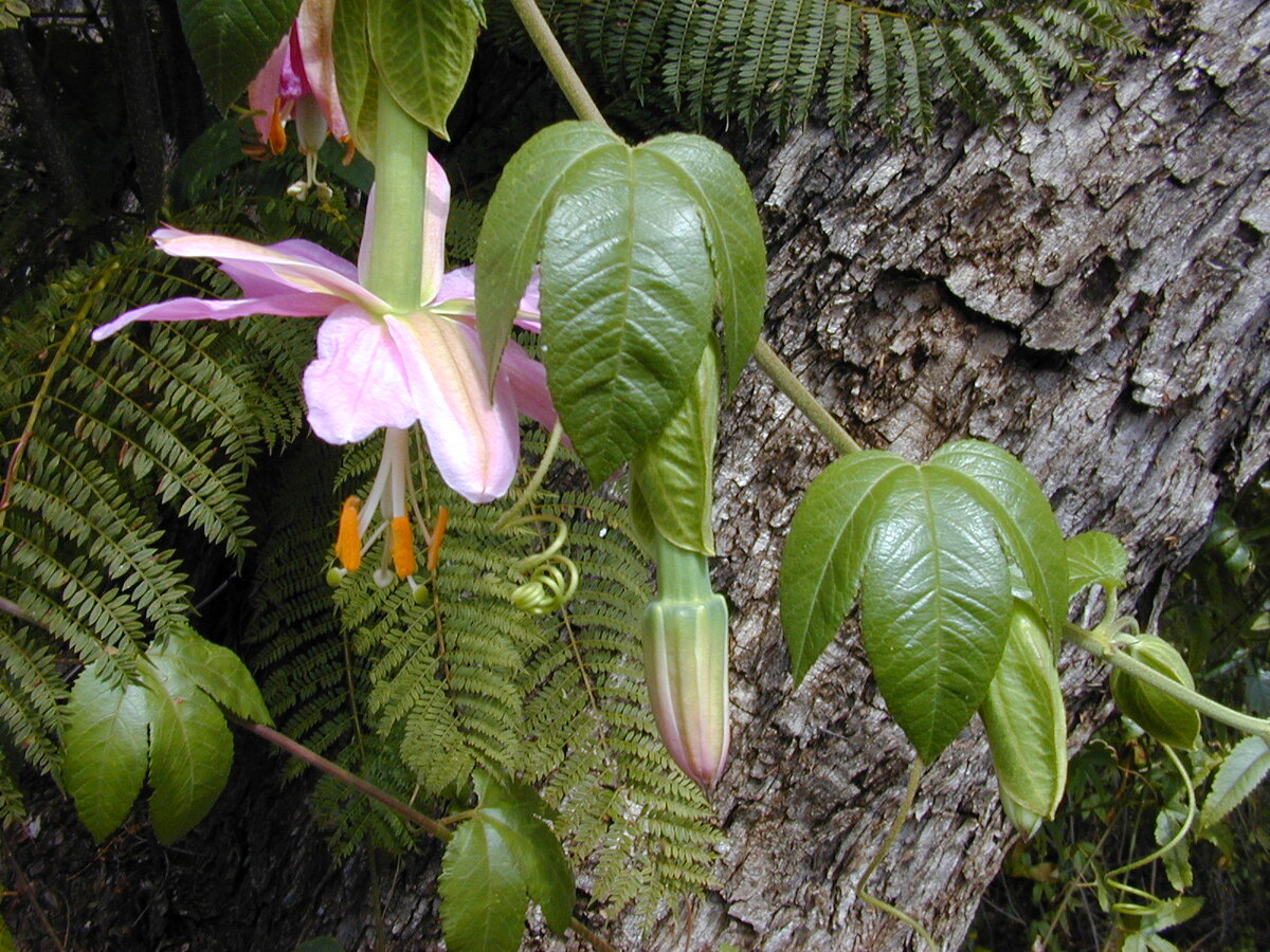 Passiflora mollissima, often called the banana passionfruit, is a vigorous, cool-tolerant vine native to the Andean cloud forests, where its long, dangling pink flowers and elongated, yellow, banana-shaped fruits make it one of the more distinctive members of the passionflower clan. The vine scrambles rapidly over trees or trellises with its tendrils, producing softly pubescent, three-lobed leaves that give it a slightly velvety look. Its tubular blossoms—rosy on the outside and pale within—are adapted to hummingbird pollination and hang like lanterns beneath the foliage. The ripe fruits have a tangy, tropical flavor reminiscent of passionfruit crossed with banana, leading to their common name, and are eaten fresh or used in juices and desserts in its native range.