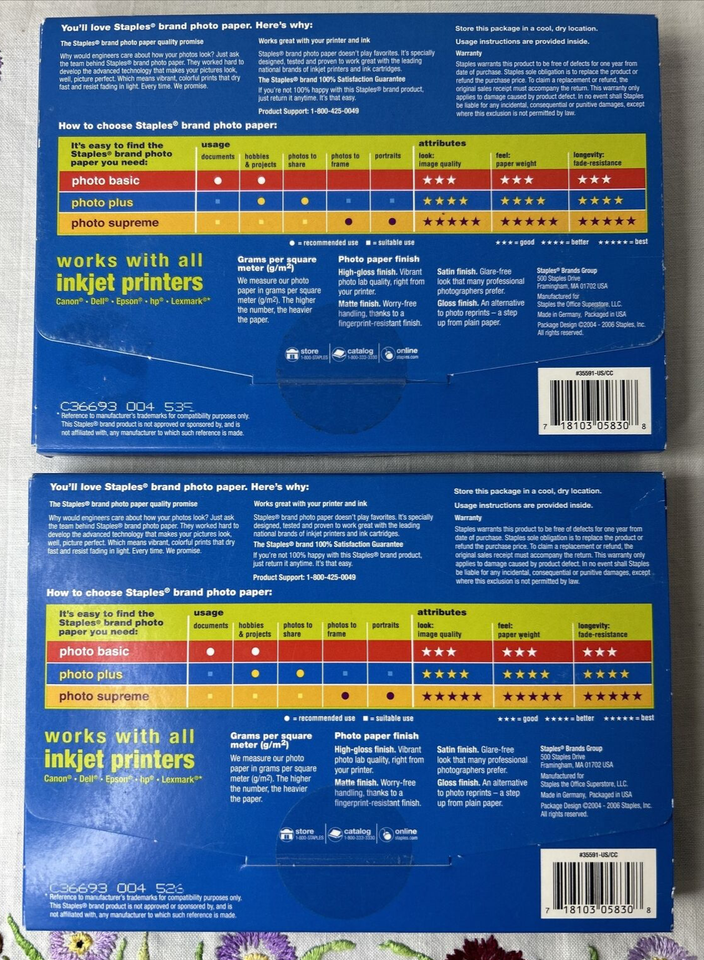 (2) Staples Photo Plus Gloss 4X6 Ink Jet Photo Paper, 60 Sheets Ea-NEW & Sealed