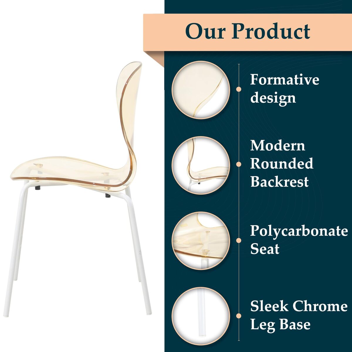 Enhance your dining area with our Oyster Dining Chair, meticulously designed to offer both style and comfort. This versatile chair features a sleek, transparent molded plastic seat and backrest that seamlessly complement any interior decor. The ergonomic curved backrest and waterfall edge seat ensure lasting comfort and proper posture support, making it perfect for extended use in dining rooms, kitchens, or offices. The chair's stability is reinforced by a sturdy X-shaped frame and stainless steel legs with a powder-coated finish, supporting up to 330 lbs. This lightweight, stackable chair is not only easy to move and store but also UV resistant, ensuring long-lasting durability even in sunlit spaces. Assembly is required, but the straightforward process makes it a hassle-free addition to your home or office.