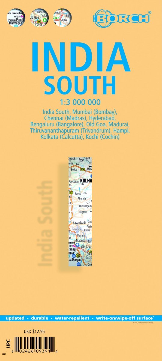 Our folded roadand travel map of Indiaincludes topsights,monuments, religious sites, point of interests,beaches, camping sites. The map distinguishes roads ranging from expressways/motorways to country lanes/paths. Map includes insetsof Mumbai, Chennai, Hyderabad, Bangalore, Old Goa, Madurai, Trivandrum, Hampi, Calcutta andCochin.Climate charts show the average daily temperatures, humidity, hours of sunshine and precipitation for each month.These Borch mapsare durable, water-repellent and feature a laminated write-on/wipe off surface and measureapproximately 9.5"x4.5" when folded up and unfolds into a flat double-sided map measuring 34"x19.25".