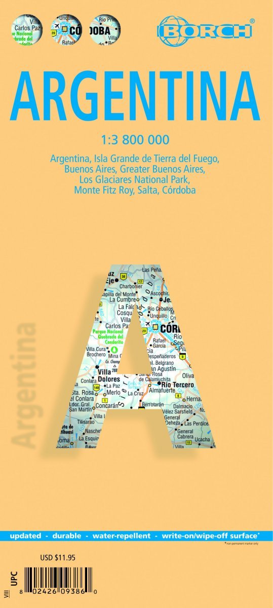 Our folded roadand travel map of Argentinaincludes topsights,monuments, religious sites, point of interests,beaches, camping sites. The map distinguishes roads ranging from expressways/motorways to country lanes/paths.The colored map includes insetsof Isla Grande de Tierra del Fuego, Buenos Aires, Greater Buenos Aires, Los Glaciares National Park, Monte Fitz Roy,Salta, Cordoba.Climate charts show the average daily temperatures, humidity, hours of sunshine and precipitation for each month.These Borch mapsare durable, water-repellent and feature a laminated write-on/wipe off surface and measureapproximately 9.5"x4.5" when folded up and unfolds into a flat double-sided map measuring 34"x19.25".