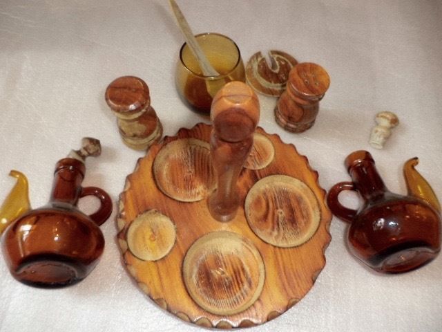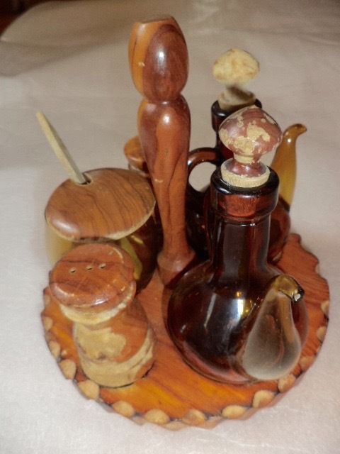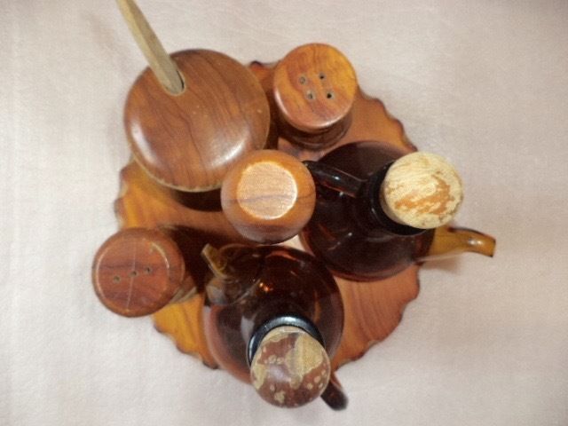 Old condiment caddy set 6pc Wood, amber glass relish olive oil and vinegar containers all have lids also includes relish serving utensil.