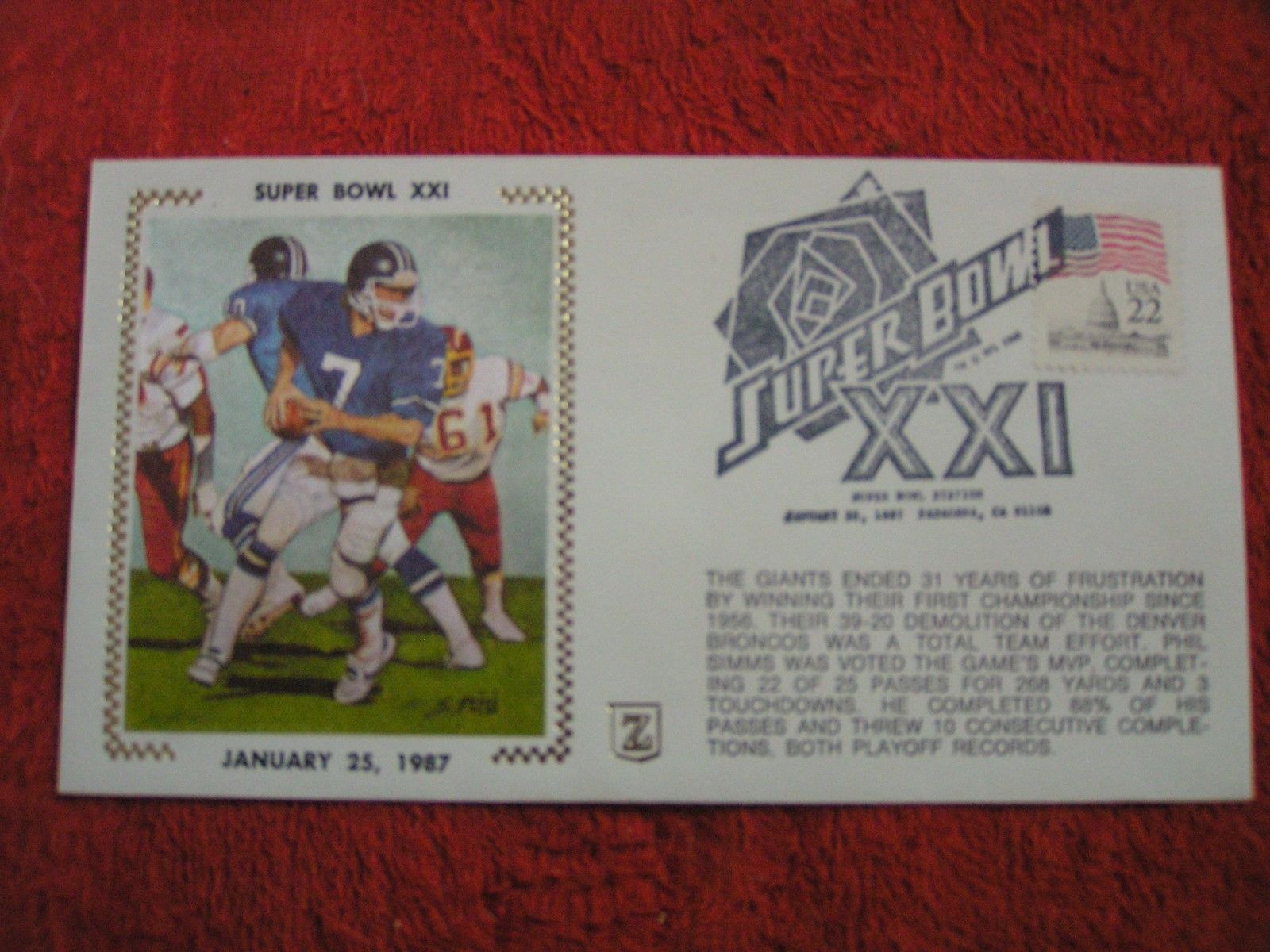 NFL NY Giants Vs. Denver Broncos Super Bowl XXI FDC CACHET ENVELOPE 1/25/1987