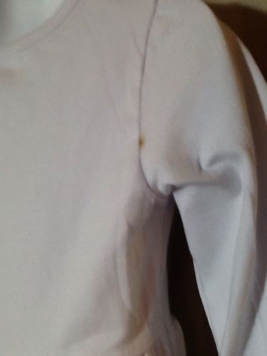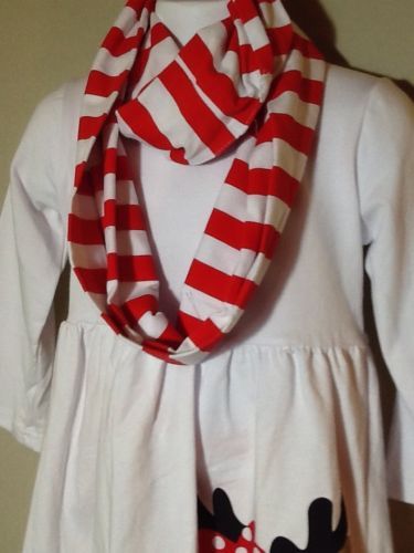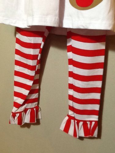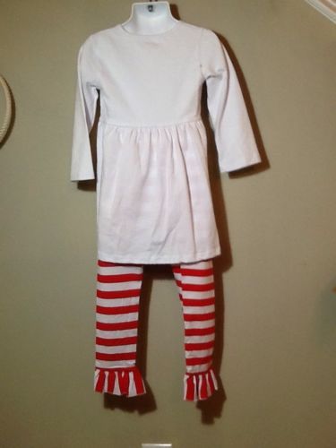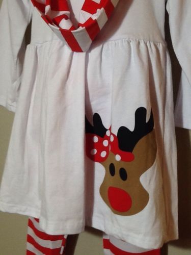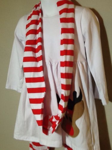 Christmas set of striped pants-matching scarf, and tunic top white with Christmas moose. New, no tags, unbranded. One spot on back by arm sleeve, see pics, this is a large child's set, will fit size 5-6x