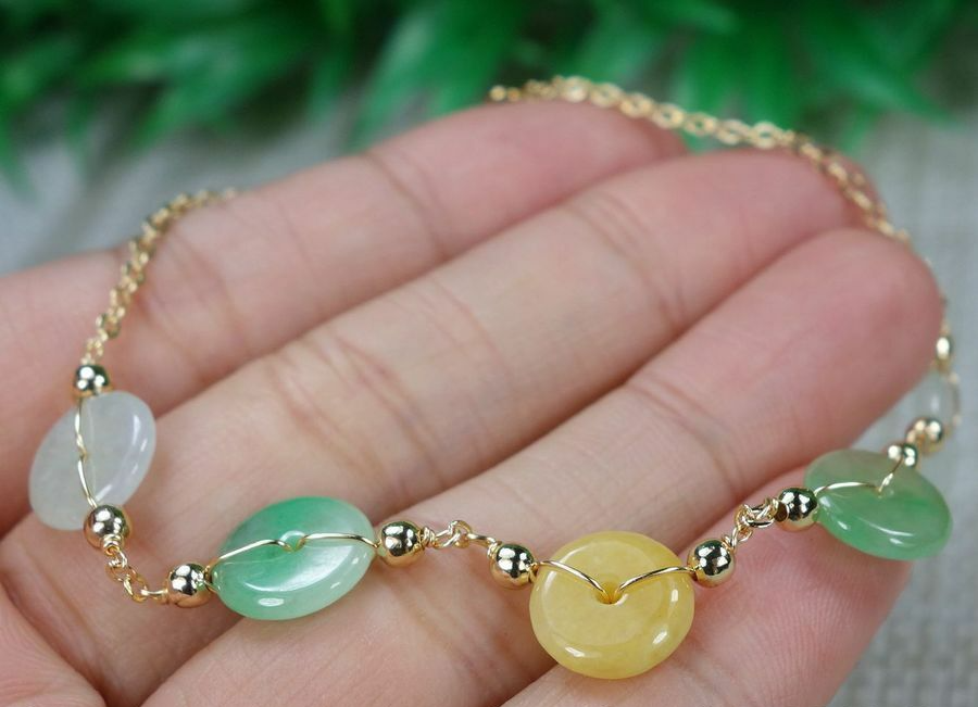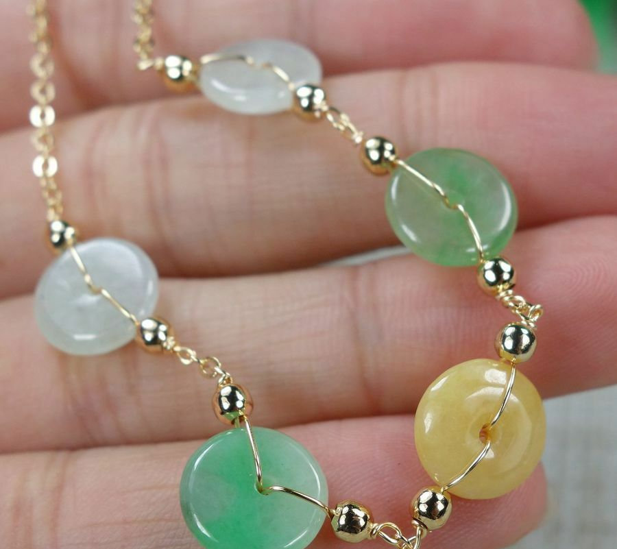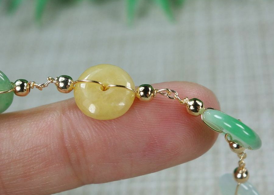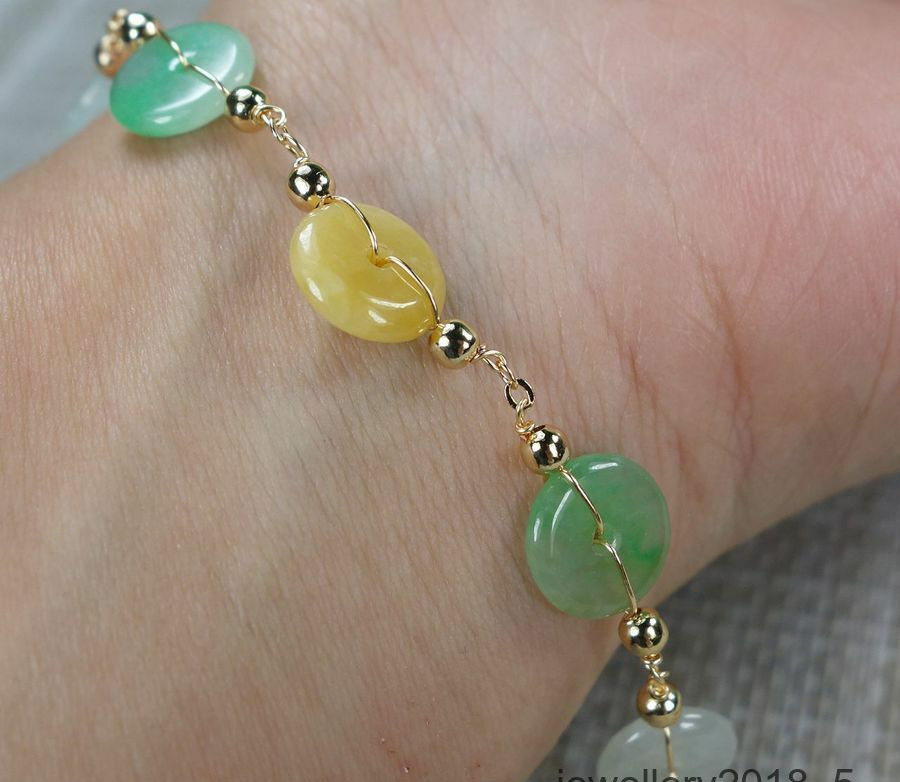 Certified Green+white+yellow 100% Natural A Jadeite jade Bracelets 14K手链