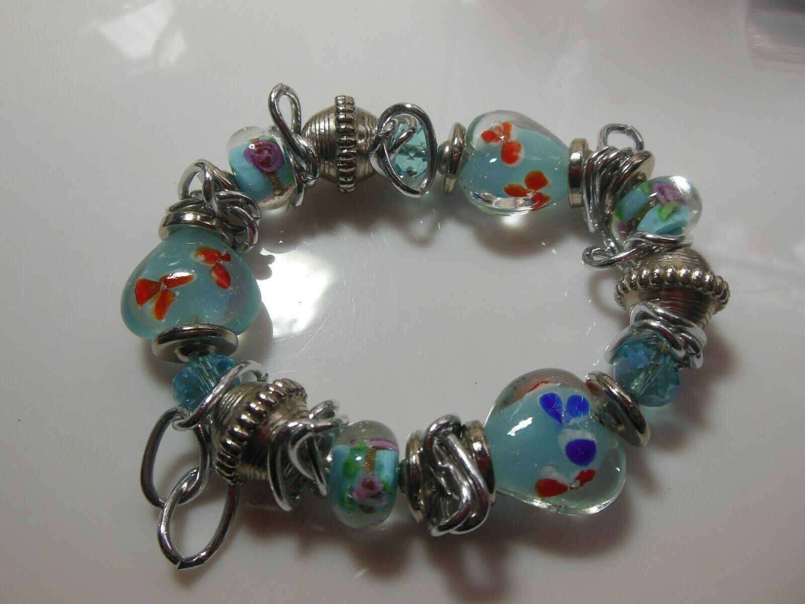 Silver-tone and Blue Floral Art Glass Heart Stretch Bracelet