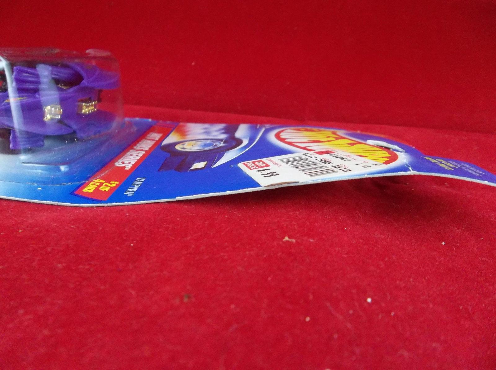 Condition: The car is brand new, still sealed on the original card. The card shows wear from age and years of storage. It is bent, has a crease, and has an old retail sticker on it. The clear plastic shell is in good shape.