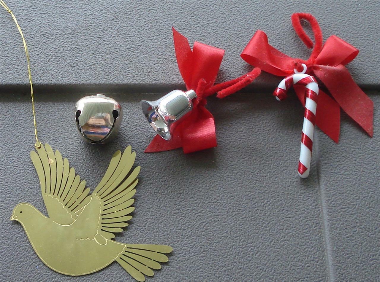 You are bidding on this lot of 4 little mini Christmas ornaments. The little candy cane is made of plastic, and is about 1.75” long. The bird is made of tin, and is about 3” from top to bottom, and is 2” from side to side. The bell is also made of tin, and is .75” from top to bottom, and is .75” in diameter. There is also a little .5" metal jingle bell. I am unsure of the age or origins of the ornaments. This is a nice set of miniature Christmas Ornaments. Very Nice.