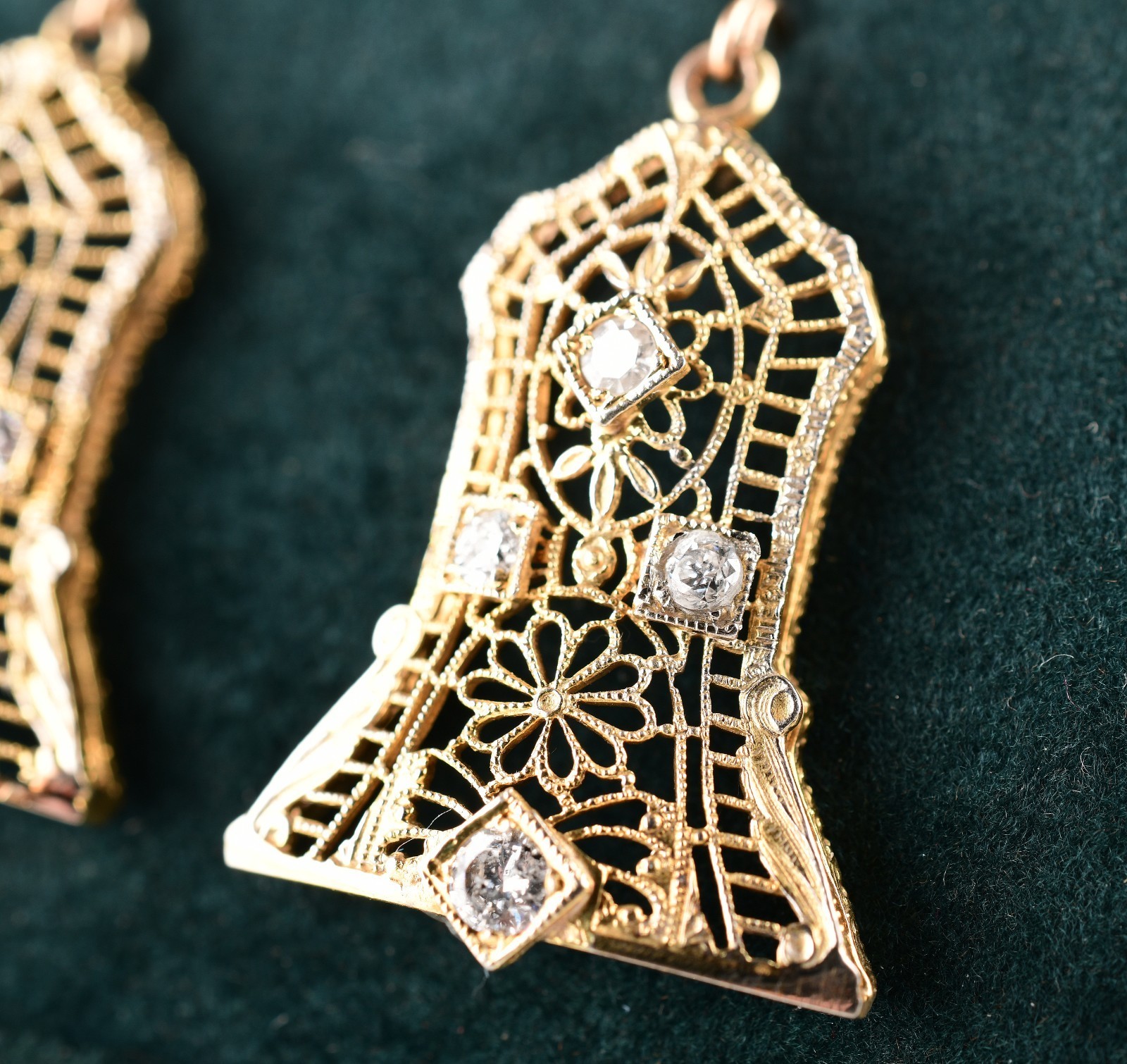14k Yellow Gold Diamond Filigree Bell Earrings