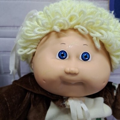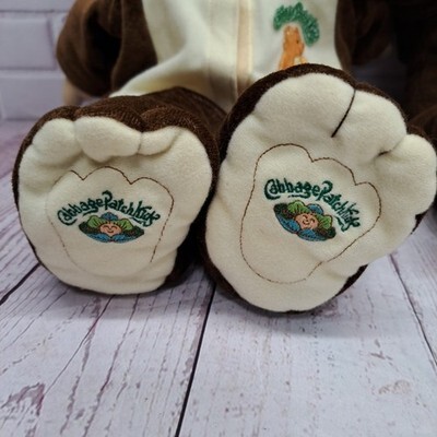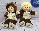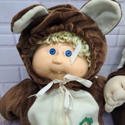 This product is a rare set of two Cabbage Patch Kids dolls with blonde hair and blue eyes, dressed in teddy bear pajamas or jumpers. , these vintage dolls are part of the Cabbage Patch Kids franchise and feature a soft vinyl body with removable clothes. Perfect for collectors. These play dolls from the 1980s also includes teddy bear outfits. A nostalgic find for fans of the Cabbage Patch Kids brand, these dolls are a unique addition to any doll collection.