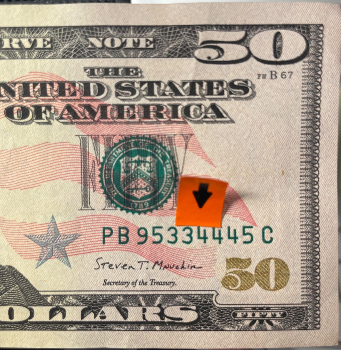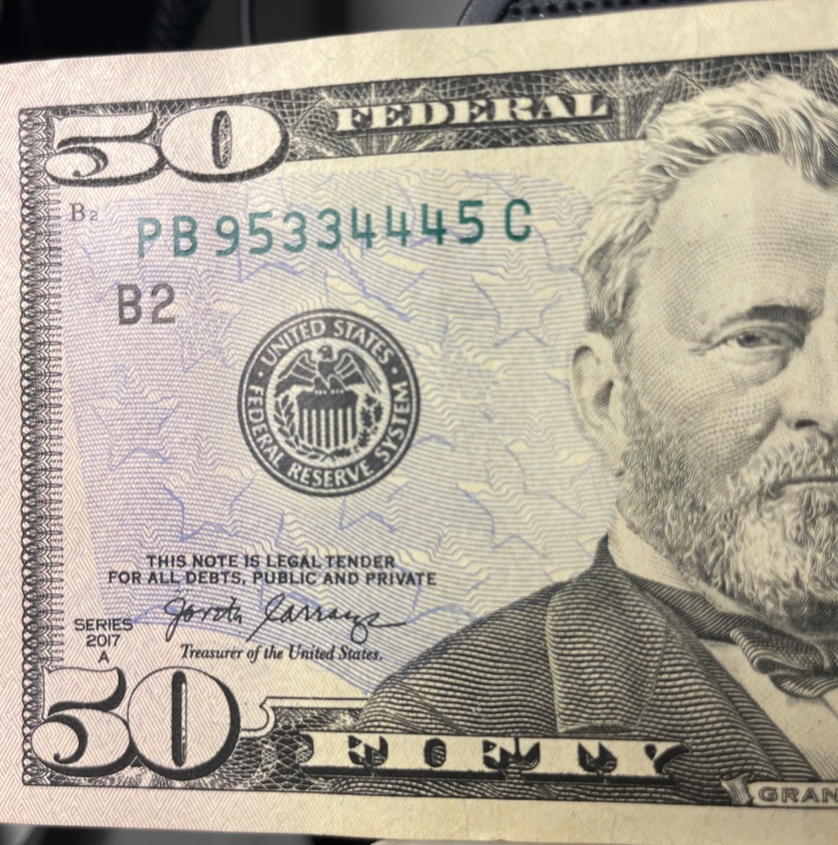 - $50 Dollar Bill 2017A Triple Serial # PB 95334445 C Nice Condition
