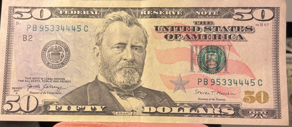 $50 Dollar Bill 2017A Triple Serial # PB 95334445 C Nice Condition